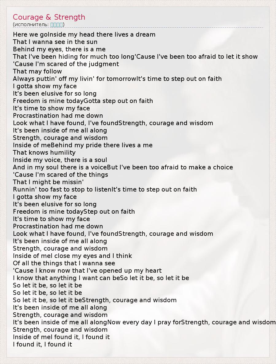 It's been inside of me all alongNow every day I pray forStrength, courage and wisdom