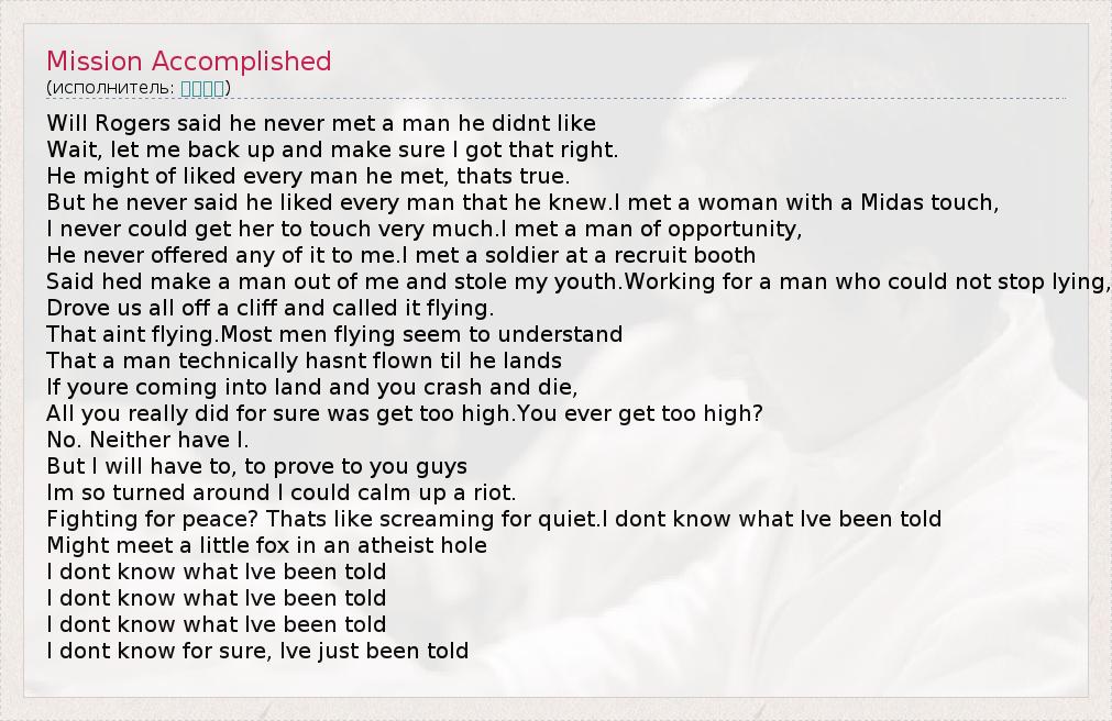 А как ты думаешь, о чем песня "Mission Accomplished" ?