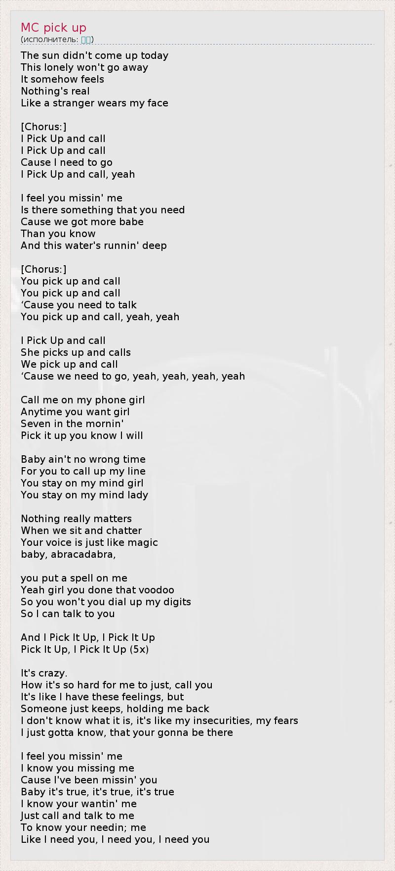 The sun didn't come up today This lonely won't go away It somehow feels Nothing's real Like a stranger wears my face [Chorus:] I Pick Up and call I Pick Up and call Cause I need to go I Pick Up and call, yeah I feel you missin' me Is there something that you need Cause we got more babe Than you know And this water's runnin' deep [Chorus:] You pick up and call You pick up and call ‘Cause you need to talk You pick up and call, yeah, yeah I Pick Up and call She picks up and calls We pick up and call ‘Cause we need to go, yeah, yeah, yeah, yeah Call me on my phone girl Anytime you want girl Seven in the mornin' Pick it up you know I will Baby ain't no wrong time For you to call up my line You stay on my mind girl You stay on my mind lady Nothing really matters When we sit and chatter Your voice is just like magic baby, abracadabra, you put a spell on me Yeah girl you done that voodoo So you won't you dial up my digits So I can talk to you And I Pick It Up, I Pick It Up Pick It Up, I Pick It Up (5x) It's crazy. How it's so hard for me to just, call you It's like I have these feelings, but Someone just keeps, holding me back I don't know what it is, it's like my insecurities, my fears I just gotta know, that your gonna be there I feel you missin' me I know you missing me Cause I've been missin' you Baby it's true, it's true, it's true I know your wantin' me Just call and talk to me To know your needin; me Like I need you, I need you, I need you