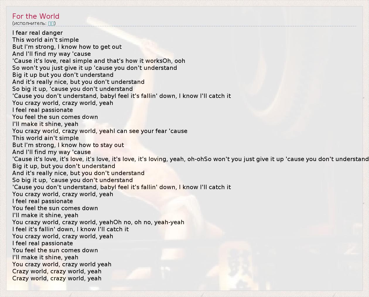 You crazy world, crazy world, yeahOh no, oh no, yeah-yeah