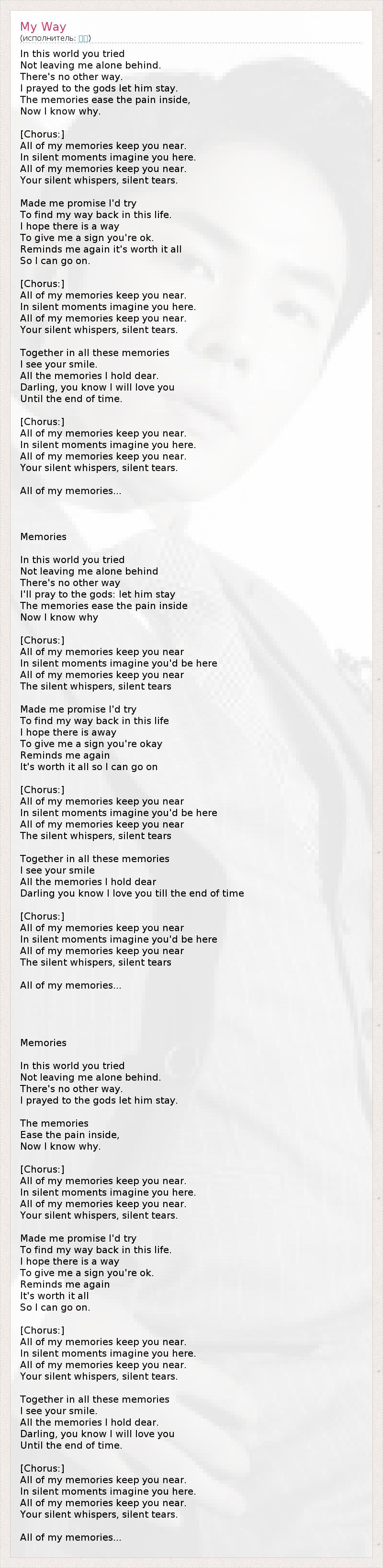 In this world you tried Not leaving me alone behind. There's no other way. I prayed to the gods let him stay. The memories ease the pain inside, Now I know why. [Chorus:] All of my memories keep you near. In silent moments imagine you here. All of my memories keep you near. Your silent whispers, silent tears. Made me promise I'd try To find my way back in this life. I hope there is a way To give me a sign you're ok. Reminds me again it's worth it all So I can go on. [Chorus:] All of my memories keep you near. In silent moments imagine you here. All of my memories keep you near. Your silent whispers, silent tears. Together in all these memories I see your smile. All the memories I hold dear. Darling, you know I will love you Until the end of time. [Chorus:] All of my memories keep you near. In silent moments imagine you here. All of my memories keep you near. Your silent whispers, silent tears. All of my memories... Memories In this world you tried Not leaving me alone behind There's no other way I'll pray to the gods: let him stay The memories ease the pain inside Now I know why [Chorus:] All of my memories keep you near In silent moments imagine you'd be here All of my memories keep you near The silent whispers, silent tears Made me promise I'd try To find my way back in this life I hope there is away To give me a sign you're okay Reminds me again It's worth it all so I can go on [Chorus:] All of my memories keep you near In silent moments imagine you'd be here All of my memories keep you near The silent whispers, silent tears Together in all these memories I see your smile All the memories I hold dear Darling you know I love you till the end of time [Chorus:] All of my memories keep you near In silent moments imagine you'd be here All of my memories keep you near The silent whispers, silent tears All of my memories... Memories In this world you tried Not leaving me alone behind. There's no other way. I prayed to the gods let him stay. The memories Ease the pain inside, Now I know why. [Chorus:] All of my memories keep you near. In silent moments imagine you here. All of my memories keep you near. Your silent whispers, silent tears. Made me promise I'd try To find my way back in this life. I hope there is a way To give me a sign you're ok. Reminds me again It's worth it all So I can go on. [Chorus:] All of my memories keep you near. In silent moments imagine you here. All of my memories keep you near. Your silent whispers, silent tears. Together in all these memories I see your smile. All the memories I hold dear. Darling, you know I will love you Until the end of time. [Chorus:] All of my memories keep you near. In silent moments imagine you here. All of my memories keep you near. Your silent whispers, silent tears. All of my memories...