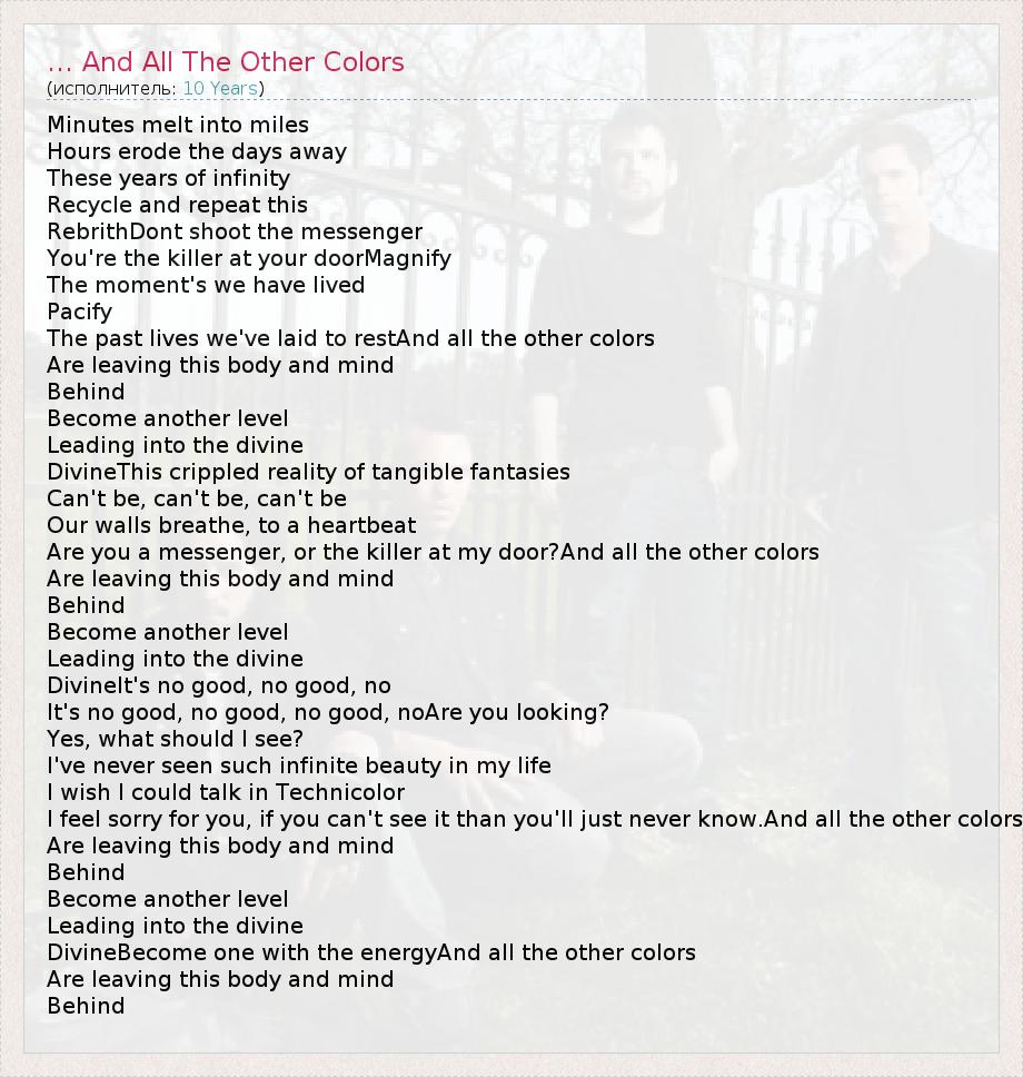 Minutes melt into miles Hours erode the days away These years of infinity Recycle and repeat this RebrithDont shoot the messenger You're the killer at your doorMagnify The moment's we have lived Pacify The past lives we've laid to restAnd all the other colors Are leaving this body and mind Behind Become another level Leading into the divine DivineThis crippled reality of tangible fantasies Can't be, can't be, can't be Our walls breathe, to a heartbeat Are you a messenger, or the killer at my door?And all the other colors Are leaving this body and mind Behind Become another level Leading into the divine DivineIt's no good, no good, no It's no good, no good, no good, noAre you looking? Yes, what should I see? I've never seen such infinite beauty in my life I wish I could talk in Technicolor I feel sorry for you, if you can't see it than you'll just never know.And all the other colors Are leaving this body and mind Behind Become another level Leading into the divine DivineBecome one with the energyAnd all the other colors Are leaving this body and mind Behind