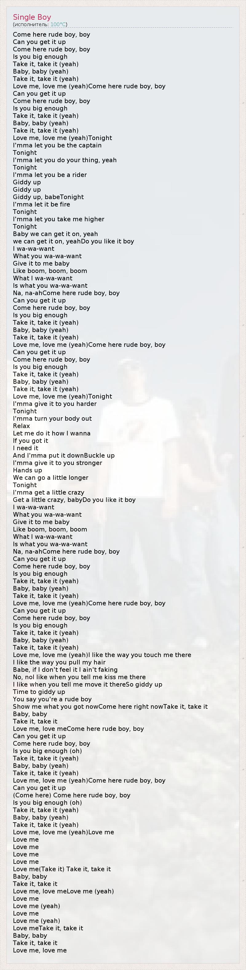 Come here rude boy, boy Can you get it up Come here rude boy, boy Is you big enough Take it, take it (yeah) Baby, baby (yeah) Take it, take it (yeah) Love me, love me (yeah)Come here rude boy, boy Can you get it up Come here rude boy, boy Is you big enough Take it, take it (yeah) Baby, baby (yeah) Take it, take it (yeah) Love me, love me (yeah)Tonight I'mma let you be the captain Tonight I'mma let you do your thing, yeah Tonight I'mma let you be a rider Giddy up Giddy up Giddy up, babeTonight I'mma let it be fire Tonight I'mma let you take me higher Tonight Baby we can get it on, yeah we can get it on, yeahDo you like it boy I wa-wa-want What you wa-wa-want Give it to me baby Like boom, boom, boom What I wa-wa-want Is what you wa-wa-want Na, na-ahCome here rude boy, boy Can you get it up Come here rude boy, boy Is you big enough Take it, take it (yeah) Baby, baby (yeah) Take it, take it (yeah) Love me, love me (yeah)Come here rude boy, boy Can you get it up Come here rude boy, boy Is you big enough Take it, take it (yeah) Baby, baby (yeah) Take it, take it (yeah) Love me, love me (yeah)Tonight I'mma give it to you harder Tonight I'mma turn your body out Relax Let me do it how I wanna If you got it I need it And I'mma put it downBuckle up I'mma give it to you stronger Hands up We can go a little longer Tonight I'mma get a little crazy Get a little crazy, babyDo you like it boy I wa-wa-want What you wa-wa-want Give it to me baby Like boom, boom, boom What I wa-wa-want Is what you wa-wa-want Na, na-ahCome here rude boy, boy Can you get it up Come here rude boy, boy Is you big enough Take it, take it (yeah) Baby, baby (yeah) Take it, take it (yeah) Love me, love me (yeah)Come here rude boy, boy Can you get it up Come here rude boy, boy Is you big enough Take it, take it (yeah) Baby, baby (yeah) Take it, take it (yeah) Love me, love me (yeah)I like the way you touch me there I like the way you pull my hair Babe, if I don't feel it I ain't faking No, noI like when you tell me kiss me there I like when you tell me move it thereSo giddy up Time to giddy up You say you're a rude boy Show me what you got nowCome here right nowTake it, take it Baby, baby Take it, take it Love me, love meCome here rude boy, boy Can you get it up Come here rude boy, boy Is you big enough (oh) Take it, take it (yeah) Baby, baby (yeah) Take it, take it (yeah) Love me, love me (yeah)Come here rude boy, boy Can you get it up (Come here) Come here rude boy, boy Is you big enough (oh) Take it, take it (yeah) Baby, baby (yeah) Take it, take it (yeah) Love me, love me (yeah)Love me Love me Love me Love me Love me Love me(Take it) Take it, take it Baby, baby Take it, take it Love me, love meLove me (yeah) Love me Love me (yeah) Love me Love me (yeah) Love meTake it, take it Baby, baby Take it, take it Love me, love me
