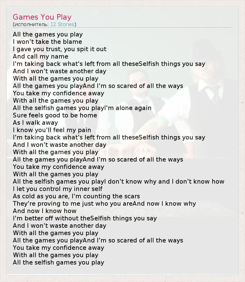 All the games you play I won't take the blame I gave you trust, you spit it out And call my name I'm taking back what's left from all theseSelfish things you say And I won't waste another day With all the games you play All the games you playAnd I'm so scared of all the ways You take my confidence away With all the games you play All the selfish games you playI'm alone again Sure feels good to be home As I walk away I know you'll feel my pain I'm taking back what's left from all theseSelfish things you say And I won't waste another day With all the games you play All the games you playAnd I'm so scared of all the ways You take my confidence away With all the games you play All the selfish games you playI don't know why and I don't know how I let you control my inner self As cold as you are, I'm counting the scars They're proving to me just who you areAnd now I know why And now I know how I'm better off without theSelfish things you say And I won't waste another day With all the games you play All the games you playAnd I'm so scared of all the ways You take my confidence away With all the games you play All the selfish games you play