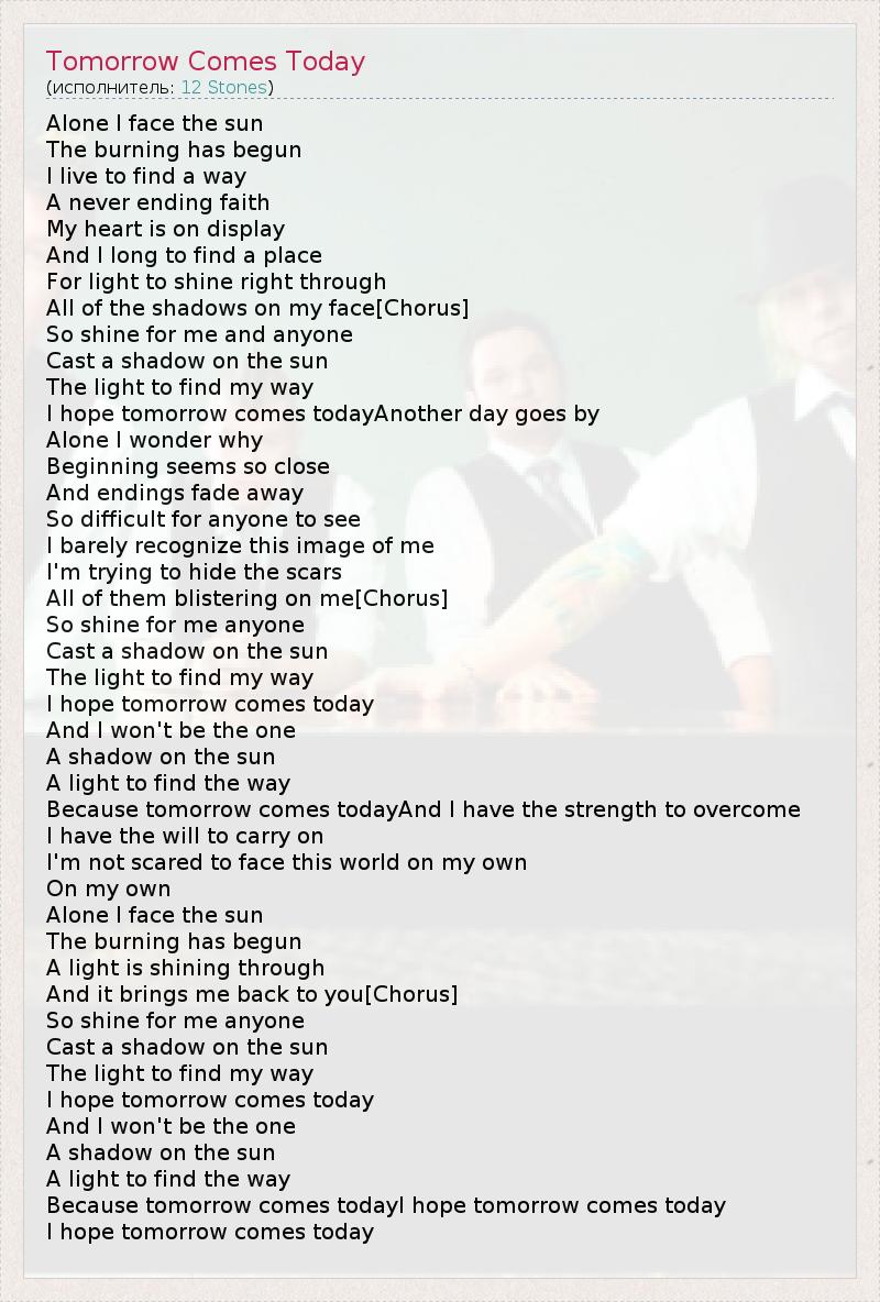 Alone I face the sun The burning has begun I live to find a way A never ending faith My heart is on display And I long to find a place For light to shine right through All of the shadows on my face[Chorus] So shine for me and anyone Cast a shadow on the sun The light to find my way I hope tomorrow comes todayAnother day goes by Alone I wonder why Beginning seems so close And endings fade away So difficult for anyone to see I barely recognize this image of me I'm trying to hide the scars All of them blistering on me[Chorus] So shine for me anyone Cast a shadow on the sun The light to find my way I hope tomorrow comes today And I won't be the one A shadow on the sun A light to find the way Because tomorrow comes todayAnd I have the strength to overcome I have the will to carry on I'm not scared to face this world on my own On my own Alone I face the sun The burning has begun A light is shining through And it brings me back to you[Chorus] So shine for me anyone Cast a shadow on the sun The light to find my way I hope tomorrow comes today And I won't be the one A shadow on the sun A light to find the way Because tomorrow comes todayI hope tomorrow comes today I hope tomorrow comes today