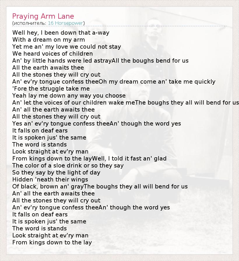 А как ты думаешь, о чем песня "Praying Arm Lane" ?