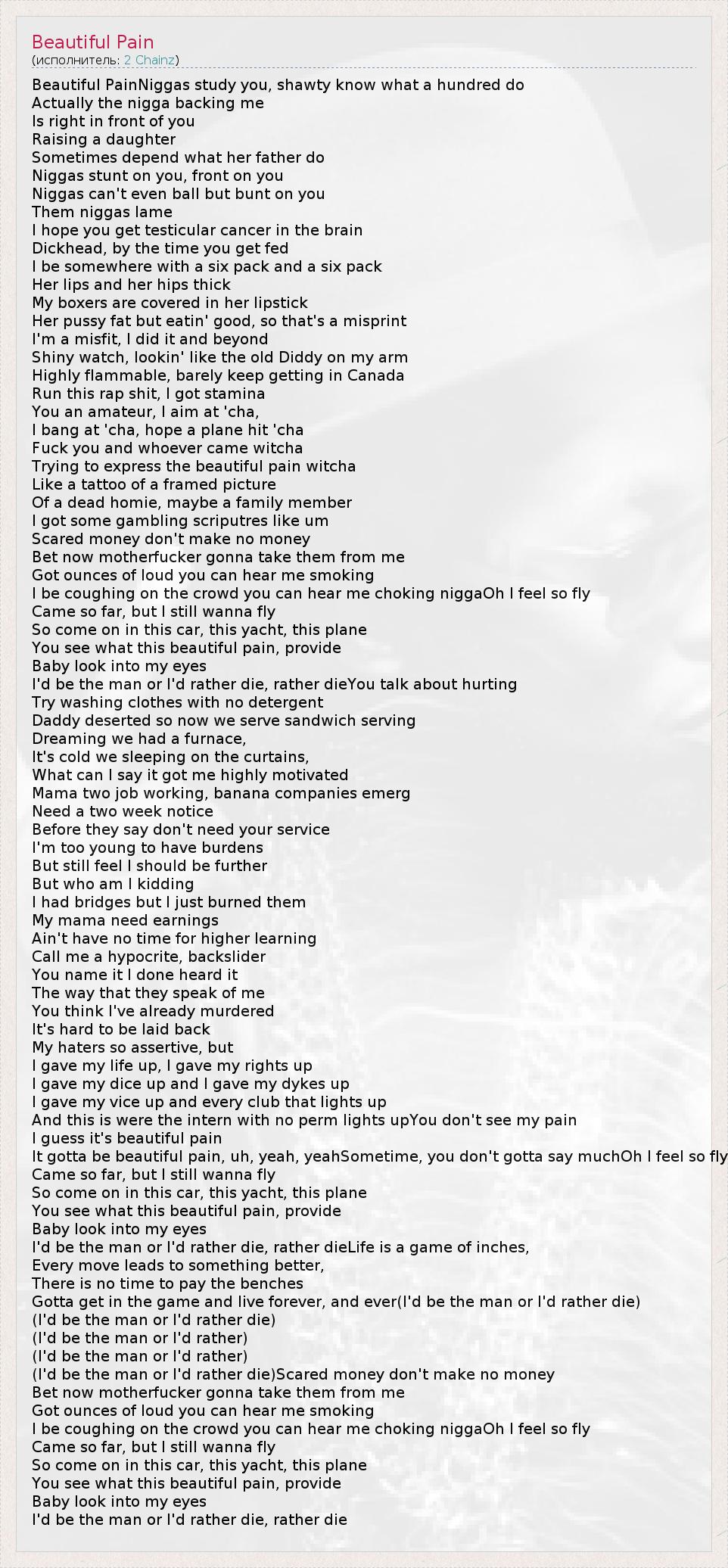 Beautiful PainNiggas study you, shawty know what a hundred do Actually the nigga backing me Is right in front of you Raising a daughter Sometimes depend what her father do Niggas stunt on you, front on you Niggas can't even ball but bunt on you Them niggas lame I hope you get testicular cancer in the brain Dickhead, by the time you get fed I be somewhere with a six pack and a six pack Her lips and her hips thick My boxers are covered in her lipstick Her pussy fat but eatin' good, so that's a misprint I'm a misfit, I did it and beyond Shiny watch, lookin' like the old Diddy on my arm Highly flammable, barely keep getting in Canada Run this rap shit, I got stamina You an amateur, I aim at 'cha, I bang at 'cha, hope a plane hit 'cha Fuck you and whoever came witcha Trying to express the beautiful pain witcha Like a tattoo of a framed picture Of a dead homie, maybe a family member I got some gambling scriputres like um Scared money don't make no money Bet now motherfucker gonna take them from me Got ounces of loud you can hear me smoking I be coughing on the crowd you can hear me choking niggaOh I feel so fly Came so far, but I still wanna fly So come on in this car, this yacht, this plane You see what this beautiful pain, provide Baby look into my eyes I'd be the man or I'd rather die, rather dieYou talk about hurting Try washing clothes with no detergent Daddy deserted so now we serve sandwich serving Dreaming we had a furnace, It's cold we sleeping on the curtains, What can I say it got me highly motivated Mama two job working, banana companies emerg Need a two week notice Before they say don't need your service I'm too young to have burdens But still feel I should be further But who am I kidding I had bridges but I just burned them My mama need earnings Ain't have no time for higher learning Call me a hypocrite, backslider You name it I done heard it The way that they speak of me You think I've already murdered It's hard to be laid back My haters so assertive, but I gave my life up, I gave my rights up I gave my dice up and I gave my dykes up I gave my vice up and every club that lights up And this is were the intern with no perm lights upYou don't see my pain I guess it's beautiful pain It gotta be beautiful pain, uh, yeah, yeahSometime, you don't gotta say muchOh I feel so fly Came so far, but I still wanna fly So come on in this car, this yacht, this plane You see what this beautiful pain, provide Baby look into my eyes I'd be the man or I'd rather die, rather dieLife is a game of inches, Every move leads to something better, There is no time to pay the benches Gotta get in the game and live forever, and ever(I'd be the man or I'd rather die) (I'd be the man or I'd rather die) (I'd be the man or I'd rather) (I'd be the man or I'd rather) (I'd be the man or I'd rather die)Scared money don't make no money Bet now motherfucker gonna take them from me Got ounces of loud you can hear me smoking I be coughing on the crowd you can hear me choking niggaOh I feel so fly Came so far, but I still wanna fly So come on in this car, this yacht, this plane You see what this beautiful pain, provide Baby look into my eyes I'd be the man or I'd rather die, rather die