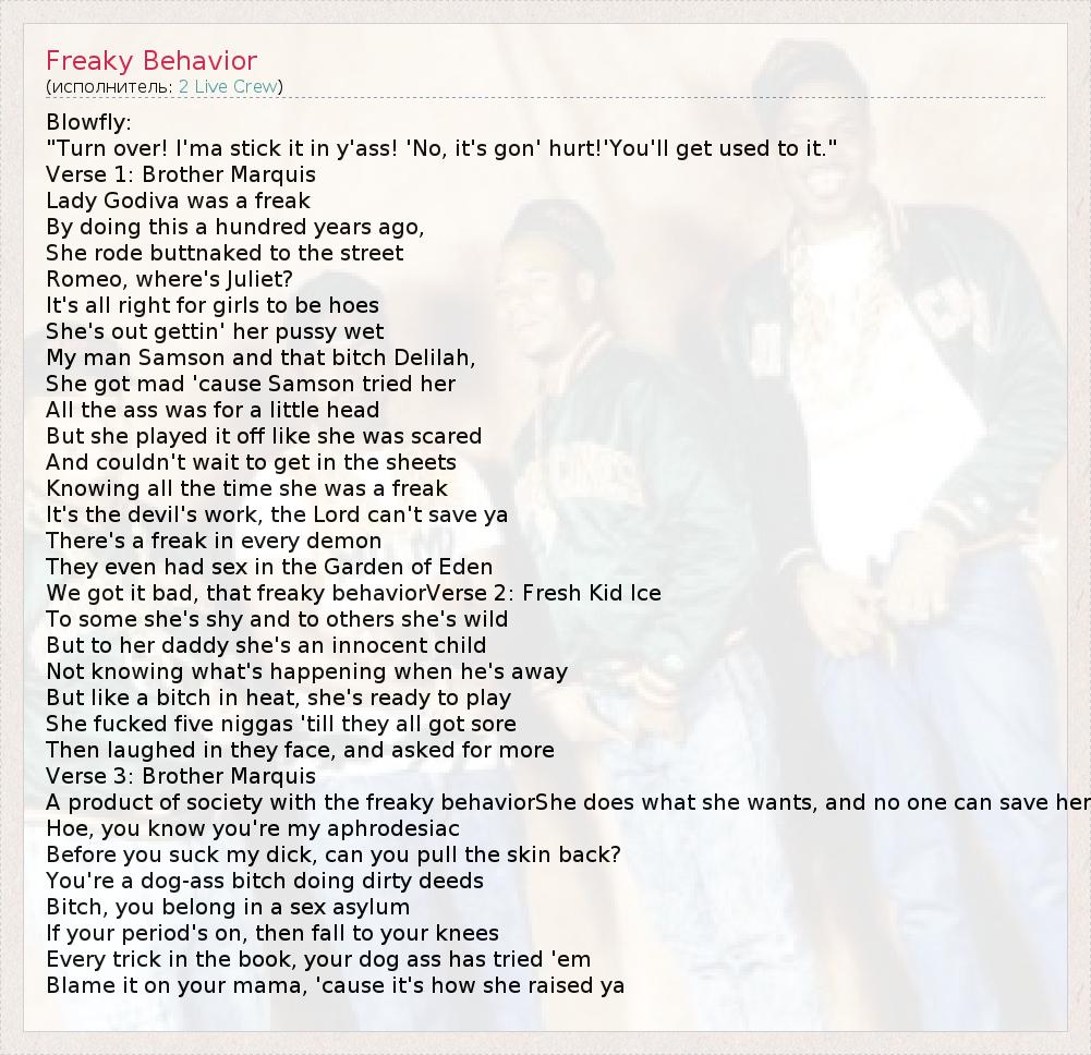 Blowfly: "Turn over! I'ma stick it in y'ass! 'No, it's gon' hurt!'You'll get used to it." Verse 1: Brother Marquis Lady Godiva was a freak By doing this a hundred years ago, She rode buttnaked to the street Romeo, where's Juliet? It's all right for girls to be hoes She's out gettin' her pussy wet My man Samson and that bitch Delilah, She got mad 'cause Samson tried her All the ass was for a little head But she played it off like she was scared And couldn't wait to get in the sheets Knowing all the time she was a freak It's the devil's work, the Lord can't save ya There's a freak in every demon They even had sex in the Garden of Eden We got it bad, that freaky behaviorVerse 2: Fresh Kid Ice To some she's shy and to others she's wild But to her daddy she's an innocent child Not knowing what's happening when he's away But like a bitch in heat, she's ready to play She fucked five niggas 'till they all got sore Then laughed in they face, and asked for more Verse 3: Brother Marquis A product of society with the freaky behaviorShe does what she wants, and no one can save her Hoe, you know you're my aphrodesiac Before you suck my dick, can you pull the skin back? You're a dog-ass bitch doing dirty deeds Bitch, you belong in a sex asylum If your period's on, then fall to your knees Every trick in the book, your dog ass has tried 'em Blame it on your mama, 'cause it's how she raised ya