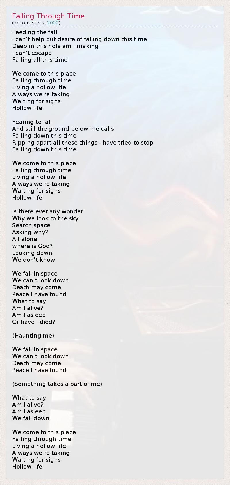 Питаю падение Не могу помочь, но желаю упасть в этот раз Глубоко в дыру, что я создаю Не могу убежать Постоянно падаю Мы пришли сюда Падаем сквозь время Живём пустой жизнью Всегда берём Ждём знаков Пустая жизнь Боюсь упасть Но землю подо мной всё ещё зовёт Падаю в этот раз Отрываю всё то, что я пытался остановить Падаю постоянно Мы пришли сюда Падаем сквозь время Живём пустой жизнью Всегда берём Ждём знаков Пустая жизнь Существует ли чудо? Зачем мы смотрим в небо, Исследуем космос? Спрашиваем «Зачем?» Все одиноки Где Бог? Смотрим вниз Не знаем Мы падаем в космос Мы не можем смотреть вниз Смерть, возможно, придёт Мир нашёл я Что сказать? Жив я? Сплю я? Или умер я? (Преследует меня) Мы падаем в космос Мы не можем смотреть вниз Смерть, возможно, придёт Мир нашёл я (Что-то забирает часть меня) Что сказать? Жив я? Сплю я? Или умер я? Мы пришли сюда Падаем сквозь время Живём пустой жизнью Всегда берём Ждём знаков Пустая жизнь Существует ли чудо? Зачем мы смотрим в небо, Исследуем космос? Спрашиваем «Зачем?» Все одиноки Где Бог? Смотрим вниз Не знаем (x2) Мы падаем в космос Мы не можем смотреть вниз Смерть, возможно, придёт Мир нашёл я