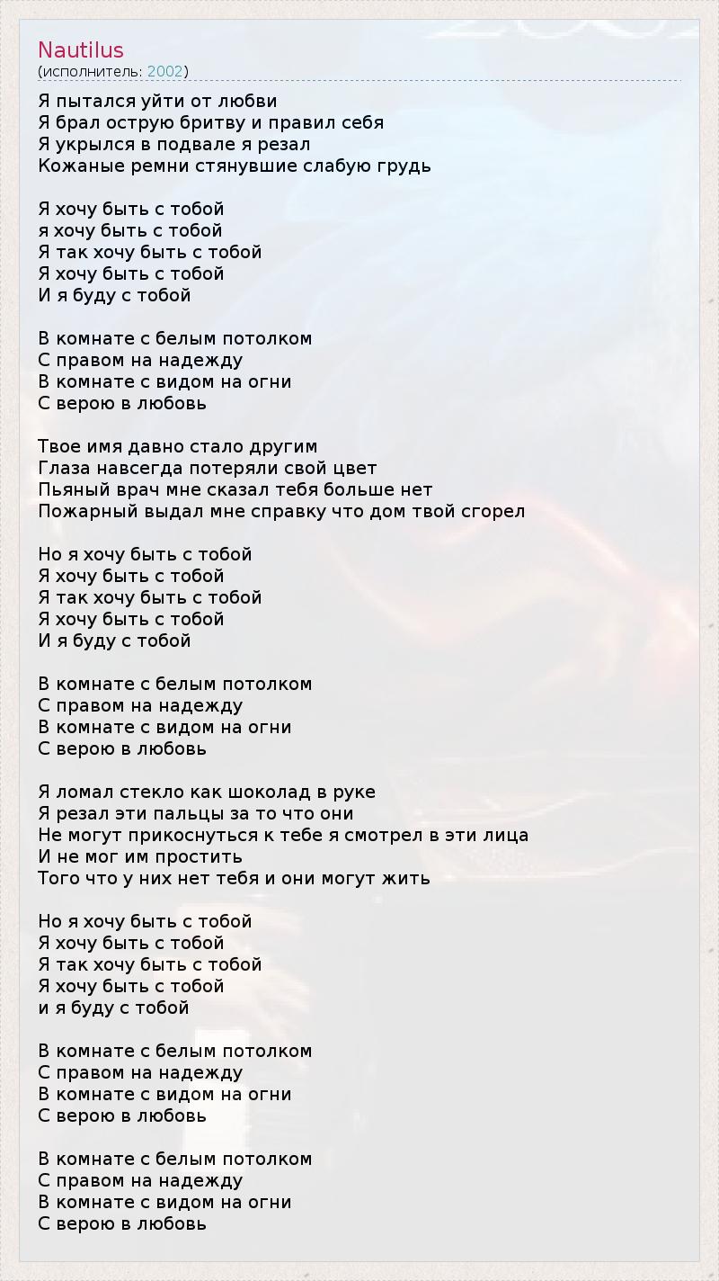 Я пытался уйти от любви Я брал острую бритву и правил себя Я укрылся в подвале я резал Кожаные ремни стянувшие слабую грудь Я хочу быть с тобой я хочу быть с тобой Я так хочу быть с тобой Я хочу быть с тобой И я буду с тобой В комнате с белым потолком С правом на надежду В комнате с видом на огни С верою в любовь Твое имя давно стало другим Глаза навсегда потеряли свой цвет Пьяный врач мне сказал тебя больше нет Пожарный выдал мне справку что дом твой сгорел Hо я хочу быть с тобой Я хочу быть с тобой Я так хочу быть с тобой Я хочу быть с тобой И я буду с тобой В комнате с белым потолком С правом на надежду В комнате с видом на огни С верою в любовь Я ломал стекло как шоколад в руке Я резал эти пальцы за то что они Hе могут прикоснуться к тебе я смотрел в эти лица И не мог им простить Того что у них нет тебя и они могут жить Hо я хочу быть с тобой Я хочу быть с тобой Я так хочу быть с тобой Я хочу быть с тобой и я буду с тобой В комнате с белым потолком С правом на надежду В комнате с видом на огни С верою в любовь В комнате с белым потолком С правом на надежду В комнате с видом на огни С верою в любовь