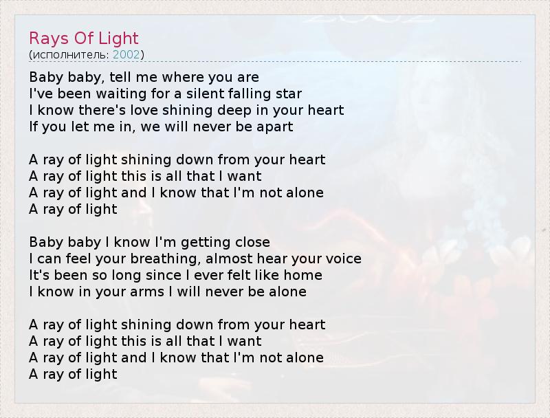 Baby baby, tell me where you are I've been waiting for a silent falling star I know there's love shining deep in your heart If you let me in, we will never be apart A ray of light shining down from your heart A ray of light this is all that I want A ray of light and I know that I'm not alone A ray of light Baby baby I know I'm getting close I can feel your breathing, almost hear your voice It's been so long since I ever felt like home I know in your arms I will never be alone A ray of light shining down from your heart A ray of light this is all that I want A ray of light and I know that I'm not alone A ray of light