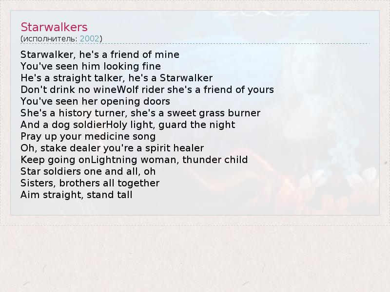 Starwalker, he's a friend of mine You've seen him looking fine He's a straight talker, he's a Starwalker Don't drink no wineWolf rider she's a friend of yours You've seen her opening doors She's a history turner, she's a sweet grass burner And a dog soldierHoly light, guard the night Pray up your medicine song Oh, stake dealer you're a spirit healer Keep going onLightning woman, thunder child Star soldiers one and all, oh Sisters, brothers all together Aim straight, stand tall