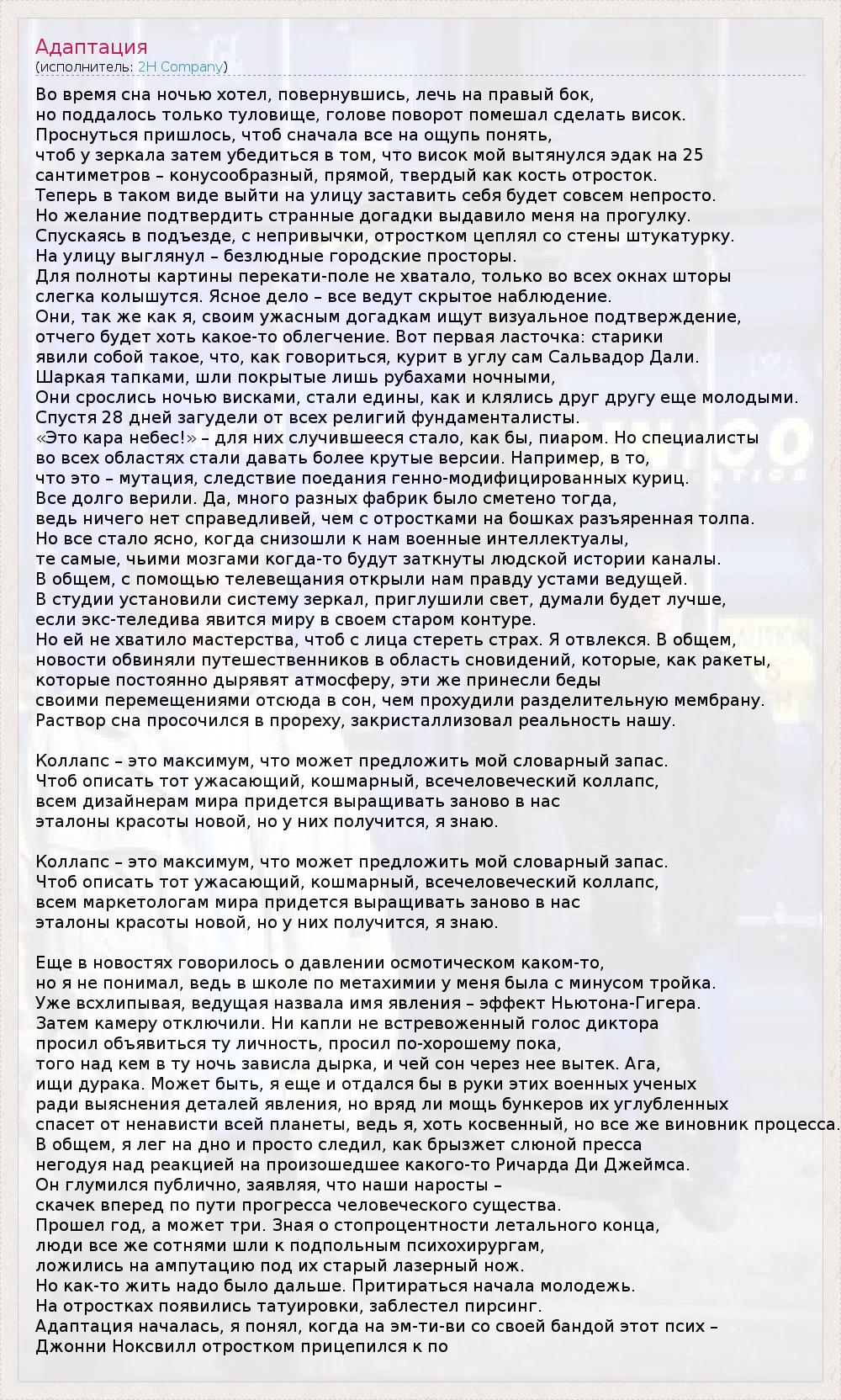 Это интересно:История 2H COMPANY начинается в тот момент, когда заканчивается история рэп-дуэта «Провинция», первого проекта Феничева и Ильина, снискавшего некое признание в Петербурге. Устав от однообразия хип-хоп тусовки, Михаилы концентрируются на студийной работе. В 1999 году их трек попадает в руки «Ёлочных Игрушек», которым в то время как раз нужно было записать что-то с вокалом для сборника электронной... продолжение