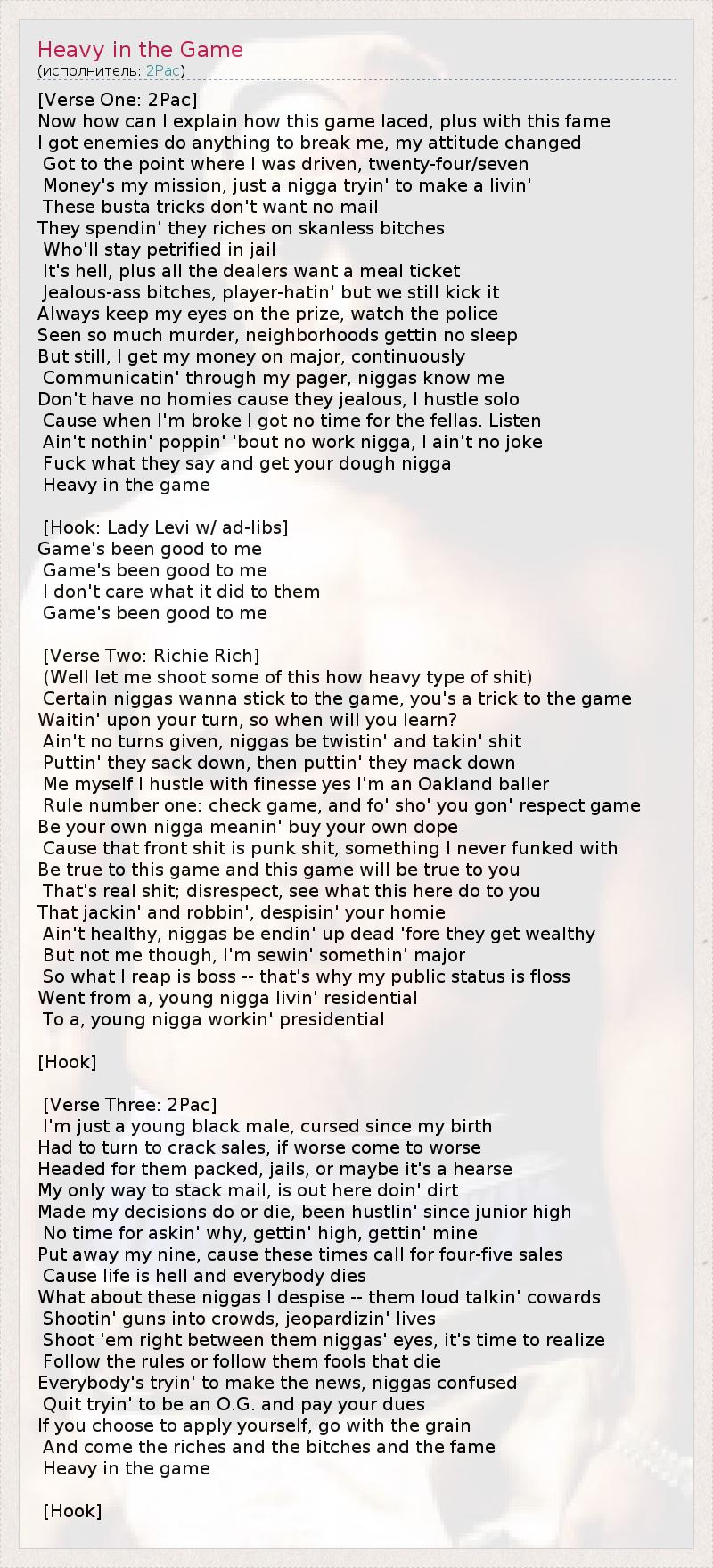А как ты думаешь, о чем песня "Heavy in the Game" ?