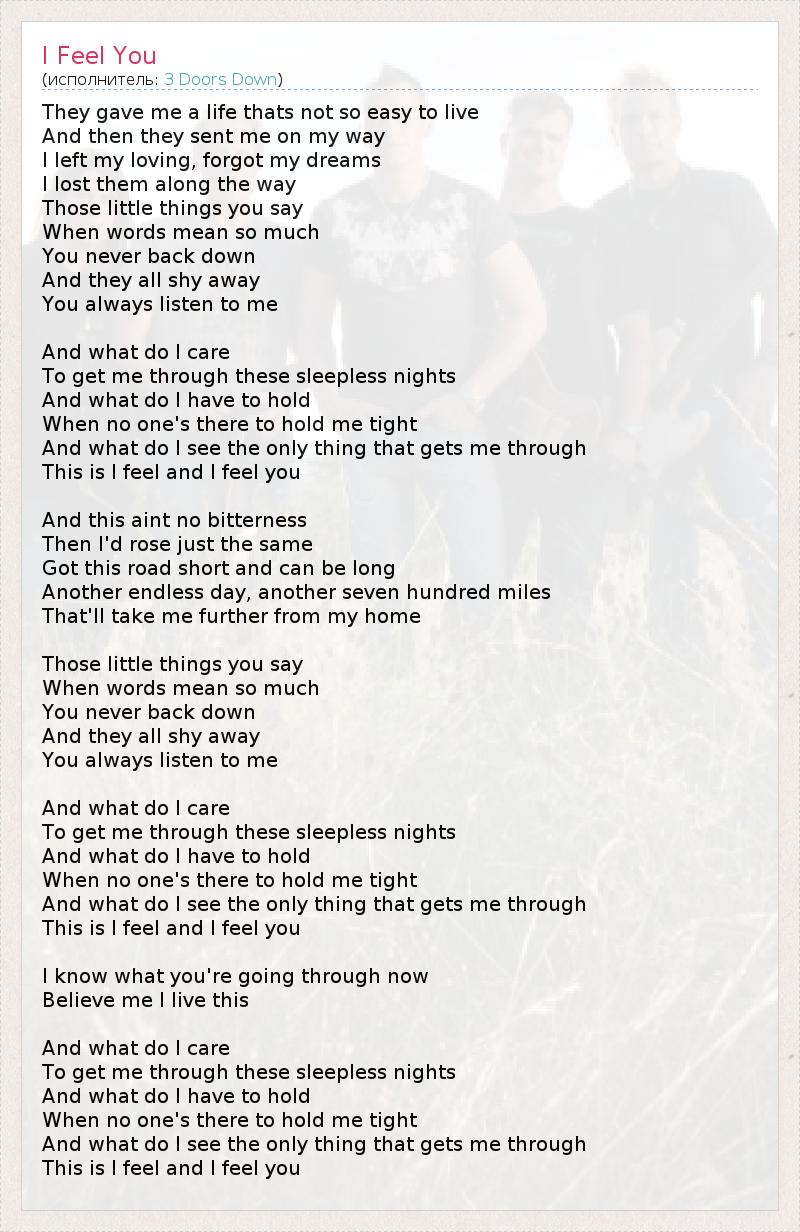 Мне дали жизнь, которую не так-то просто прожить, А затем наставили на мой путь. Я оставил свою любовь, забыл свои мечты, Я потерял их по дороге... Ты говоришь такие мелочи, Когда слова значат так много... Ты никогда не отступишь, А они, напротив, уходят от ответа... Ты всегда выслушаешь меня... Что поможет мне Пережить эти бессонные ночи? Что у меня есть, Если нет никого рядом, кто бы крепко обнял меня? И что я вижу? Единственное, что проведёт меня через всё это, - Мои чувства, и я чувствую тебя... И нет никакой горечи, Потом я так же бы встал на этот путь, Который кажется то долгим, то коротким... Ещё один бесконечный день, ещё семь сотен миль, Которые уведут меня дальше от моего дома... Ты говоришь такие мелочи, Когда слова значат так много... Ты никогда не отступишь, А они, напротив, уходят от ответа... Ты всегда выслушаешь меня... Что поможет мне Пережить эти бессонные ночи? Что у меня есть, Если нет никого рядом, кто бы крепко обнял меня? И что я вижу? Единственное, что проведёт меня через всё это, - Мои чувства, и я чувствую тебя... Я знаю, чтО ты сейчас переживаешь, Поверь мне, я живу этим... Что поможет мне Пережить эти бессонные ночи? Что у меня есть, Если нет никого рядом, кто бы крепко обнял меня? И что я вижу? Единственное, что проведёт меня через всё это, - Мои чувства, и я чувствую тебя...
