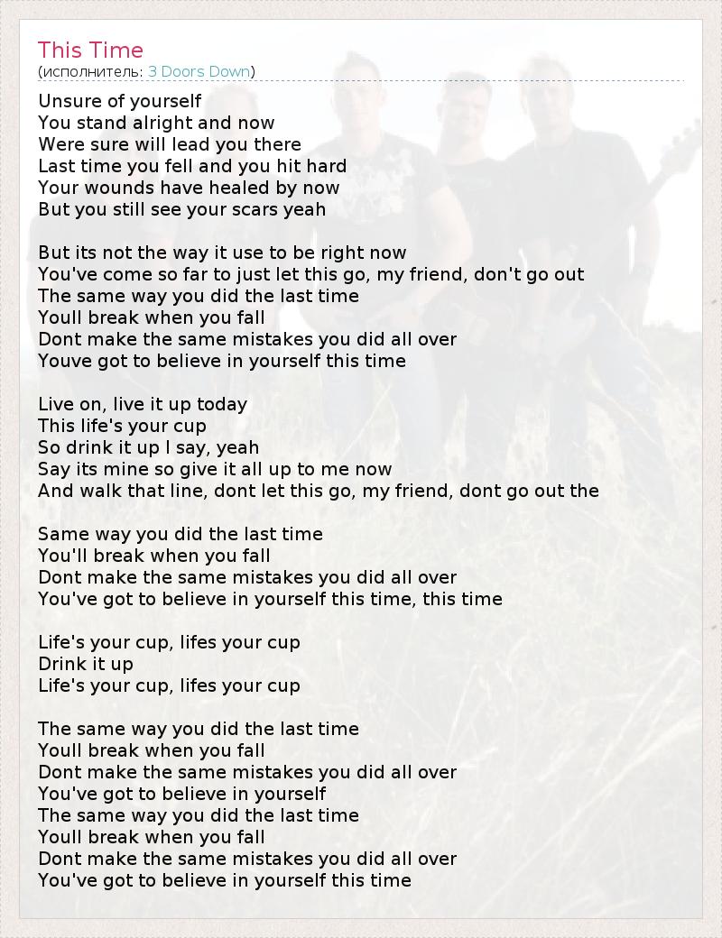 Unsure of yourself You stand alright and now Were sure will lead you there Last time you fell and you hit hard Your wounds have healed by now But you still see your scars yeah But its not the way it use to be right now You've come so far to just let this go, my friend, don't go out The same way you did the last time Youll break when you fall Dont make the same mistakes you did all over Youve got to believe in yourself this time Live on, live it up today This life's your cup So drink it up I say, yeah Say its mine so give it all up to me now And walk that line, dont let this go, my friend, dont go out the Same way you did the last time You'll break when you fall Dont make the same mistakes you did all over You've got to believe in yourself this time, this time Life's your cup, lifes your cup Drink it up Life's your cup, lifes your cup The same way you did the last time Youll break when you fall Dont make the same mistakes you did all over You've got to believe in yourself The same way you did the last time Youll break when you fall Dont make the same mistakes you did all over You've got to believe in yourself this time