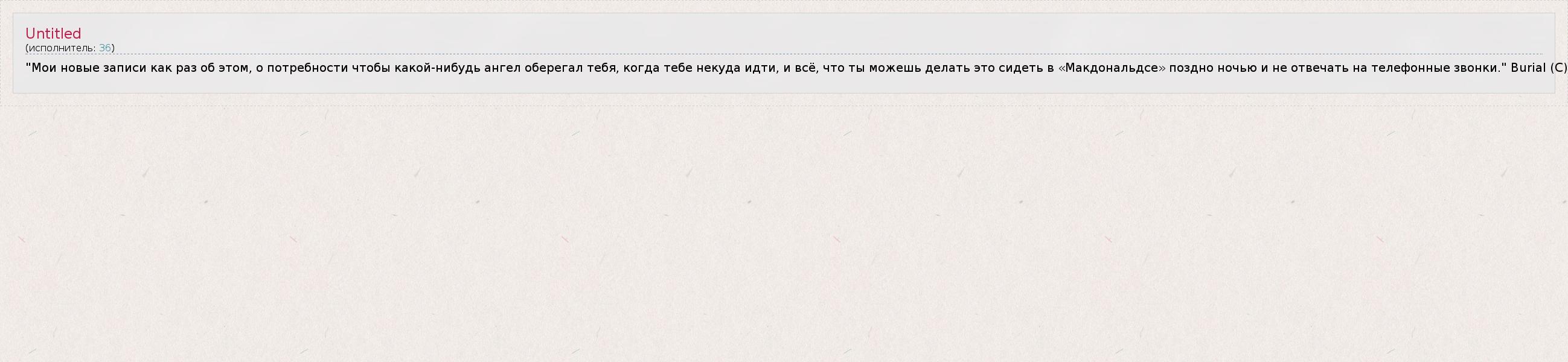 "Мои новые записи как раз об этом, о потребности чтобы какой-нибудь ангел оберегал тебя, когда тебе некуда идти, и всё, что ты можешь делать это сидеть в «Макдональдсе» поздно ночью и не отвечать на телефонные звонки." Burial (C)
