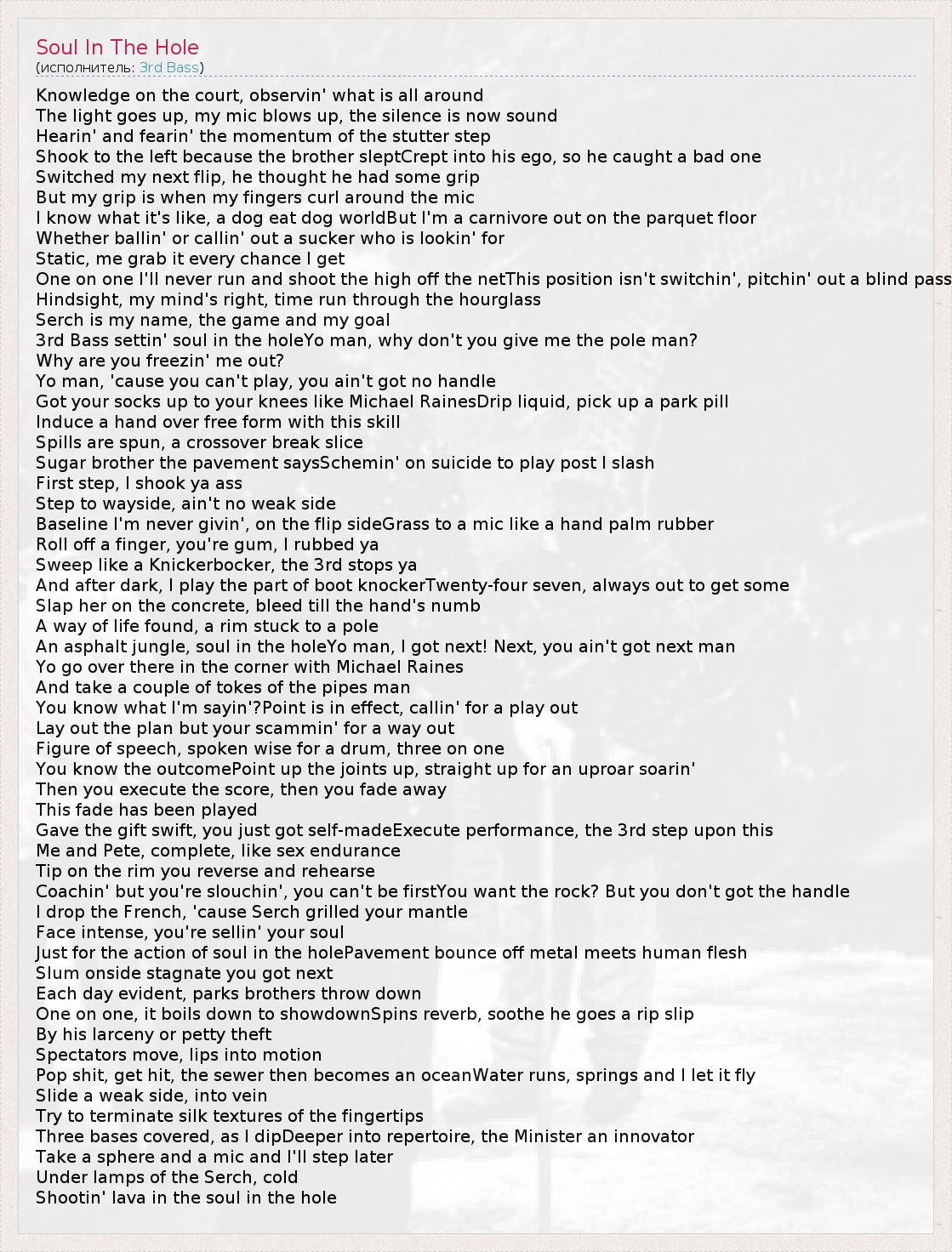 Knowledge on the court, observin' what is all around The light goes up, my mic blows up, the silence is now sound Hearin' and fearin' the momentum of the stutter step Shook to the left because the brother sleptCrept into his ego, so he caught a bad one Switched my next flip, he thought he had some grip But my grip is when my fingers curl around the mic I know what it's like, a dog eat dog worldBut I'm a carnivore out on the parquet floor Whether ballin' or callin' out a sucker who is lookin' for Static, me grab it every chance I get One on one I'll never run and shoot the high off the netThis position isn't switchin', pitchin' out a blind pass Hindsight, my mind's right, time run through the hourglass Serch is my name, the game and my goal 3rd Bass settin' soul in the holeYo man, why don't you give me the pole man? Why are you freezin' me out? Yo man, 'cause you can't play, you ain't got no handle Got your socks up to your knees like Michael RainesDrip liquid, pick up a park pill Induce a hand over free form with this skill Spills are spun, a crossover break slice Sugar brother the pavement saysSchemin' on suicide to play post I slash First step, I shook ya ass Step to wayside, ain't no weak side Baseline I'm never givin', on the flip sideGrass to a mic like a hand palm rubber Roll off a finger, you're gum, I rubbed ya Sweep like a Knickerbocker, the 3rd stops ya And after dark, I play the part of boot knockerTwenty-four seven, always out to get some Slap her on the concrete, bleed till the hand's numb A way of life found, a rim stuck to a pole An asphalt jungle, soul in the holeYo man, I got next! Next, you ain't got next man Yo go over there in the corner with Michael Raines And take a couple of tokes of the pipes man You know what I'm sayin'?Point is in effect, callin' for a play out Lay out the plan but your scammin' for a way out Figure of speech, spoken wise for a drum, three on one You know the outcomePoint up the joints up, straight up for an uproar soarin' Then you execute the score, then you fade away This fade has been played Gave the gift swift, you just got self-madeExecute performance, the 3rd step upon this Me and Pete, complete, like sex endurance Tip on the rim you reverse and rehearse Coachin' but you're slouchin', you can't be firstYou want the rock? But you don't got the handle I drop the French, 'cause Serch grilled your mantle Face intense, you're sellin' your soul Just for the action of soul in the holePavement bounce off metal meets human flesh Slum onside stagnate you got next Each day evident, parks brothers throw down One on one, it boils down to showdownSpins reverb, soothe he goes a rip slip By his larceny or petty theft Spectators move, lips into motion Pop shit, get hit, the sewer then becomes an oceanWater runs, springs and I let it fly Slide a weak side, into vein Try to terminate silk textures of the fingertips Three bases covered, as I dipDeeper into repertoire, the Minister an innovator Take a sphere and a mic and I'll step later Under lamps of the Serch, cold Shootin' lava in the soul in the hole