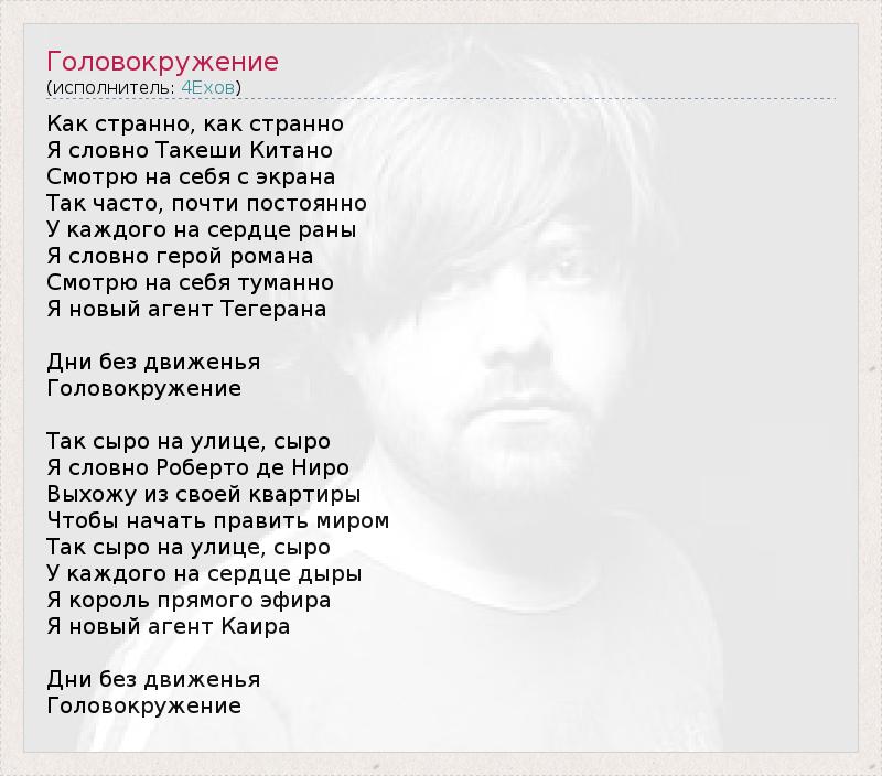 Это интересно:Официальный сайт: http://www.4ehov.com/4ехов - это музыкальный проект Паши Евлахова. Исполнителя, автора музыки и текстов.Это своеобразное творческое объединение, где песни Паши находят свою форму в сотрудничестве с различными музыкантами.Начался он в Питере, в 2004 году. Тогда песня "Ранен тобой" (записанная вместе с музыкантами группы "Картель")... продолжение