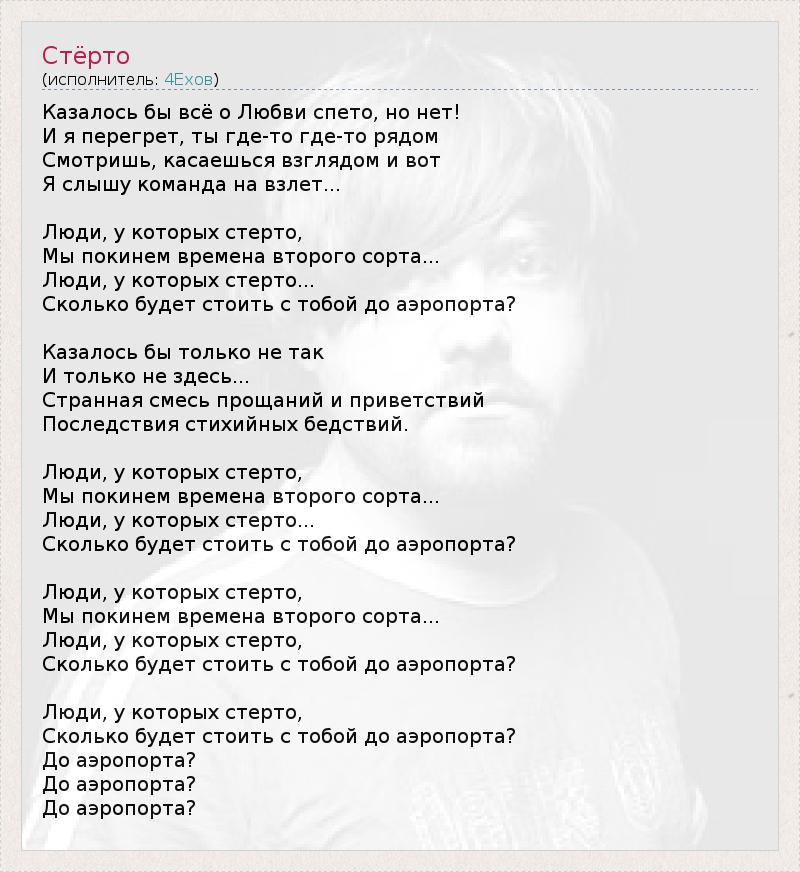 Это интересно:Официальный сайт: http://www.4ehov.com/4ехов - это музыкальный проект Паши Евлахова. Исполнителя, автора музыки и текстов.Это своеобразное творческое объединение, где песни Паши находят свою форму в сотрудничестве с различными музыкантами.Начался он в Питере, в 2004 году. Тогда песня "Ранен тобой" (записанная вместе с музыкантами группы "Картель")... продолжение