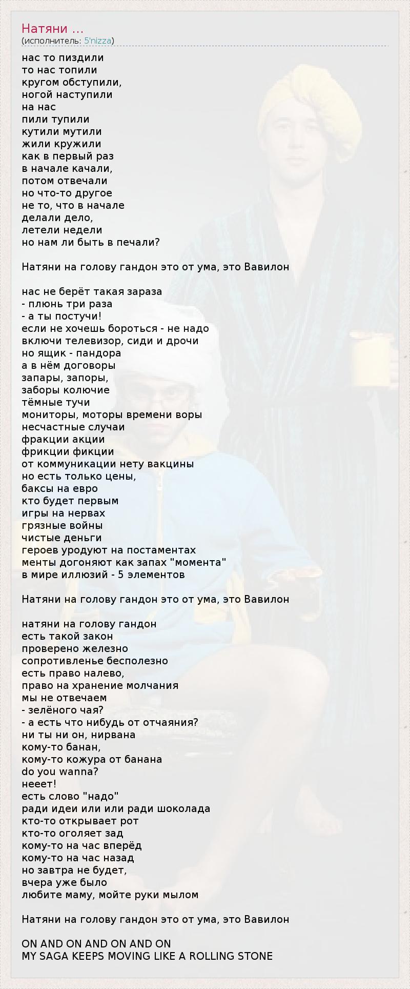 нас то пиздили то нас топили кругом обступили, ногой наступили на нас пили тупили кутили мутили жили кружили как в первый раз в начале качали, потом отвечали но что-то другое не то, что в начале делали дело, летели недели но нам ли быть в печали? Натяни на голову гандон это от ума, это Вавилон нас не берёт такая зараза - плюнь три раза - а ты постучи! если не хочешь бороться - не надо включи телевизор, сиди и дрочи но ящик - пандора а в нём договоры запары, запоры, заборы колючие тёмные тучи мониторы, моторы времени воры несчастные случаи фракции акции фрикции фикции от коммуникации нету вакцины но есть только цены, баксы на евро кто будет первым игры на нервах грязные войны чистые деньги героев уродуют на постаментах менты догоняют как запах "момента" в мире иллюзий - 5 элементов Натяни на голову гандон это от ума, это Вавилон натяни на голову гандон есть такой закон проверено железно сопротивленье бесполезно есть право налево, право на хранение молчания мы не отвечаем - зелёного чая? - а есть что нибудь от отчаяния? ни ты ни он, нирвана кому-то банан, кому-то кожура от банана do you wanna? нееет! есть слово "надо" ради идеи или или ради шоколада кто-то открывает рот кто-то оголяет зад кому-то на час вперёд кому-то на час назад но завтра не будет, вчера уже было любите маму, мойте руки мылом Натяни на голову гандон это от ума, это Вавилон ON AND ON AND ON AND ON MY SAGA KEEPS MOVING LIKE A ROLLING STONE