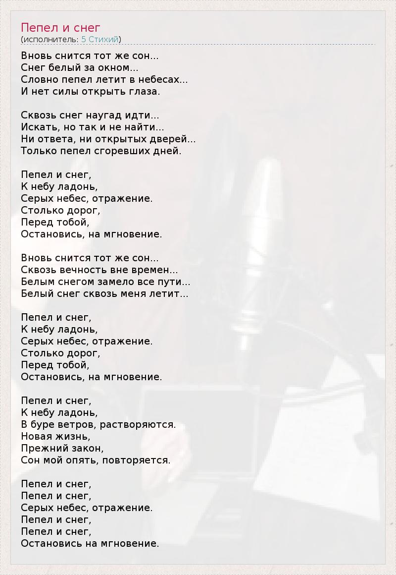 Вновь снится тот же сон... Снег белый за окном... Словно пепел летит в небесах... И нет силы открыть глаза. Сквозь снег наугад идти... Искать, но так и не найти... Ни ответа, ни открытых дверей... Только пепел сгоревших дней. Пепел и снег, К небу ладонь, Серых небес, отражение. Столько дорог, Перед тобой, Остановись, на мгновение. Вновь снится тот же сон... Сквозь вечность вне времен... Белым снегом замело все пути... Белый снег сквозь меня летит... Пепел и снег, К небу ладонь, Серых небес, отражение. Столько дорог, Перед тобой, Остановись, на мгновение. Пепел и снег, К небу ладонь, В буре ветров, растворяются. Новая жизнь, Прежний закон, Сон мой опять, повторяется. Пепел и снег, Пепел и снег, Серых небес, отражение. Пепел и снег, Пепел и снег, Остановись на мгновение.