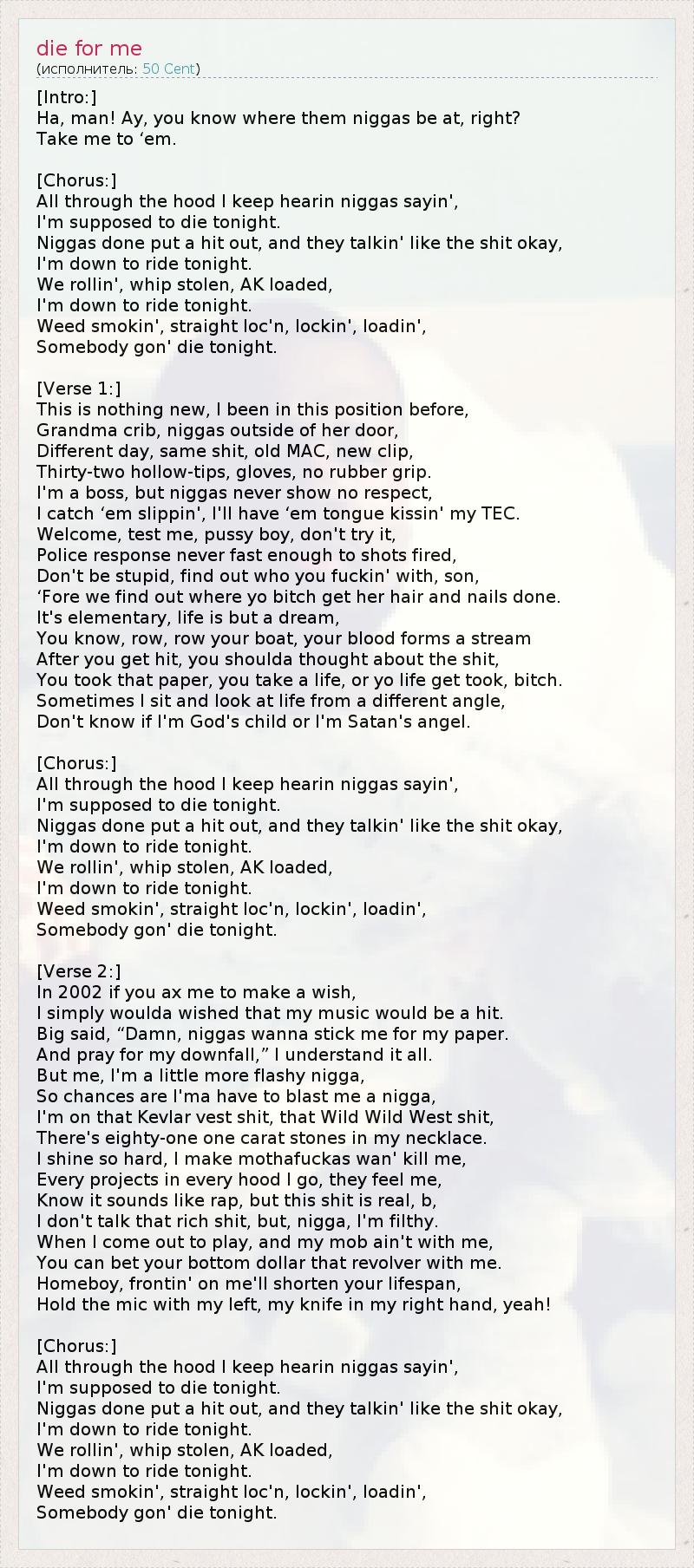 2 — The Notorious B.I.G. — знаменитый нью-йоркский рэпер, легенда Восточного побережья; убит в 1997 году. Здесь 50 Cent цитирует строчки из его песен "Warning" и "My Downfall".