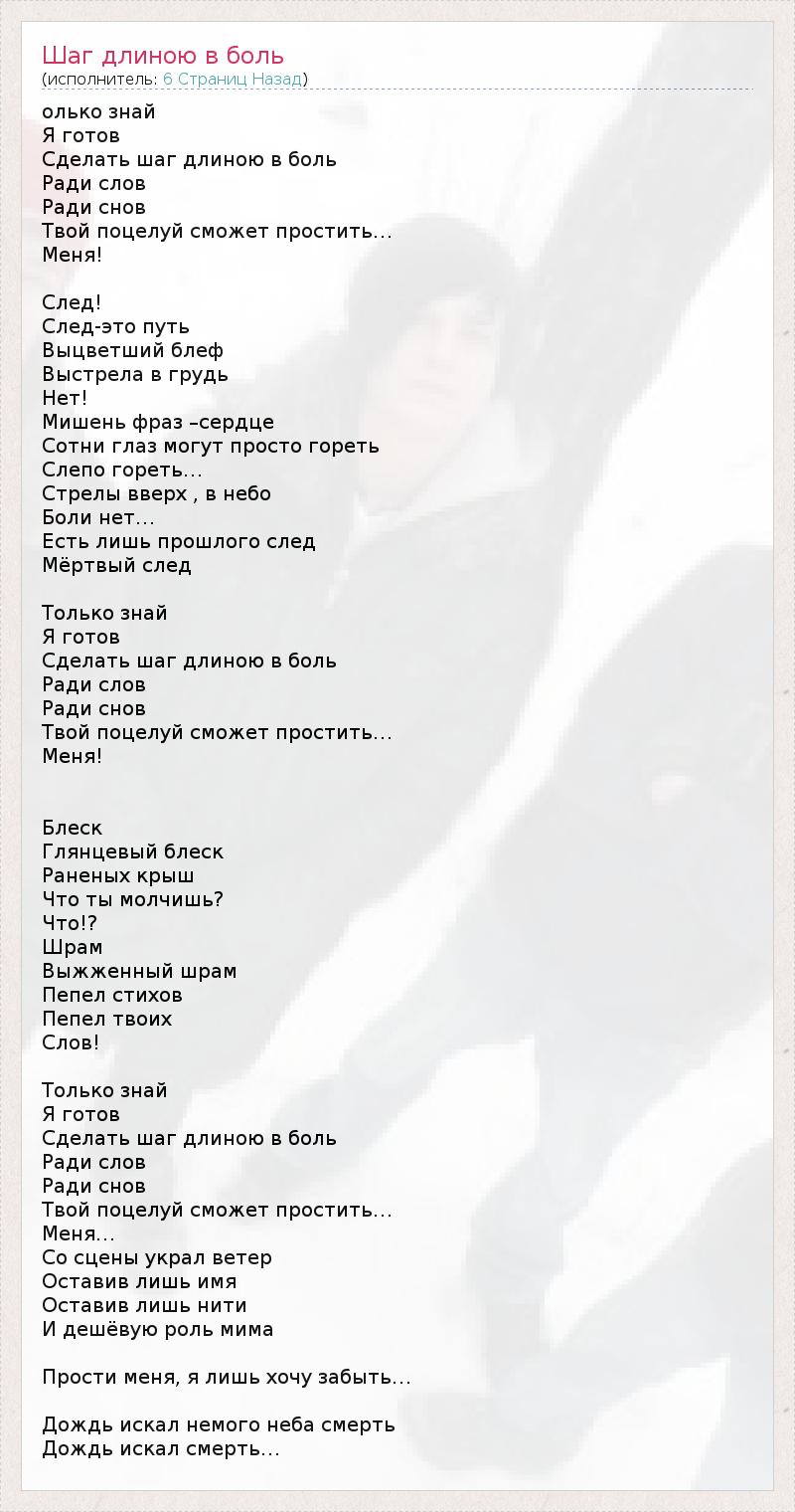 олько знай Я готов Сделать шаг длиною в боль Ради слов Ради снов Твой поцелуй сможет простить… Меня! След! След-это путь Выцветший блеф Выстрела в грудь Нет! Мишень фраз –сердце Сотни глаз могут просто гореть Слепо гореть… Стрелы вверх , в небо Боли нет… Есть лишь прошлого след Мёртвый след Только знай Я готов Сделать шаг длиною в боль Ради слов Ради снов Твой поцелуй сможет простить… Меня! Блеск Глянцевый блеск Раненых крыш Что ты молчишь? Что!? Шрам Выжженный шрам Пепел стихов Пепел твоих Слов! Только знай Я готов Сделать шаг длиною в боль Ради слов Ради снов Твой поцелуй сможет простить… Меня… Со сцены украл ветер Оставив лишь имя Оставив лишь нити И дешёвую роль мима Прости меня, я лишь хочу забыть… Дождь искал немого неба смерть Дождь искал смерть…