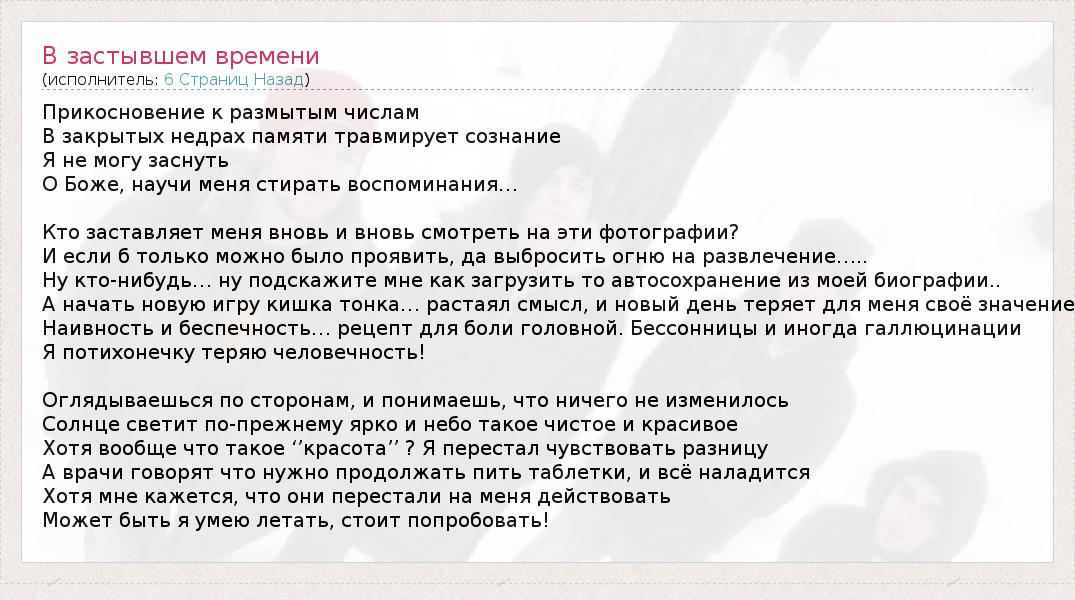 А как ты думаешь, о чем песня "В застывшем времени" ?