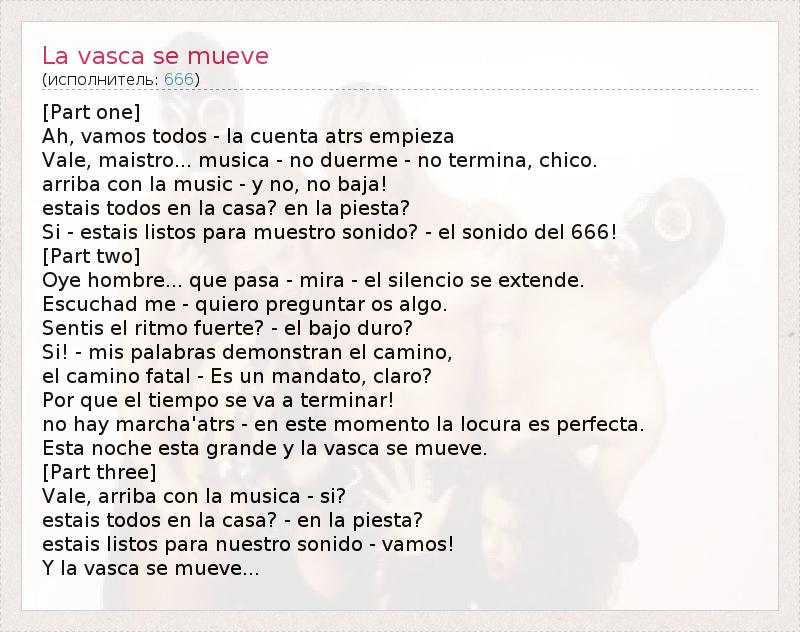 [Part one] Ah, vamos todos - la cuenta atrs empieza Vale, maistro... musica - no duerme - no termina, chico. arriba con la music - y no, no baja! estais todos en la casa? en la piesta? Si - estais listos para muestro sonido? - el sonido del 666! [Part two] Oye hombre... que pasa - mira - el silencio se extende. Escuchad me - quiero preguntar os algo. Sentis el ritmo fuerte? - el bajo duro? Si! - mis palabras demonstran el camino, el camino fatal - Es un mandato, claro? Por que el tiempo se va a terminar! no hay marcha'atrs - en este momento la locura es perfecta. Esta noche esta grande y la vasca se mueve. [Part three] Vale, arriba con la musica - si? estais todos en la casa? - en la piesta? estais listos para nuestro sonido - vamos! Y la vasca se mueve...