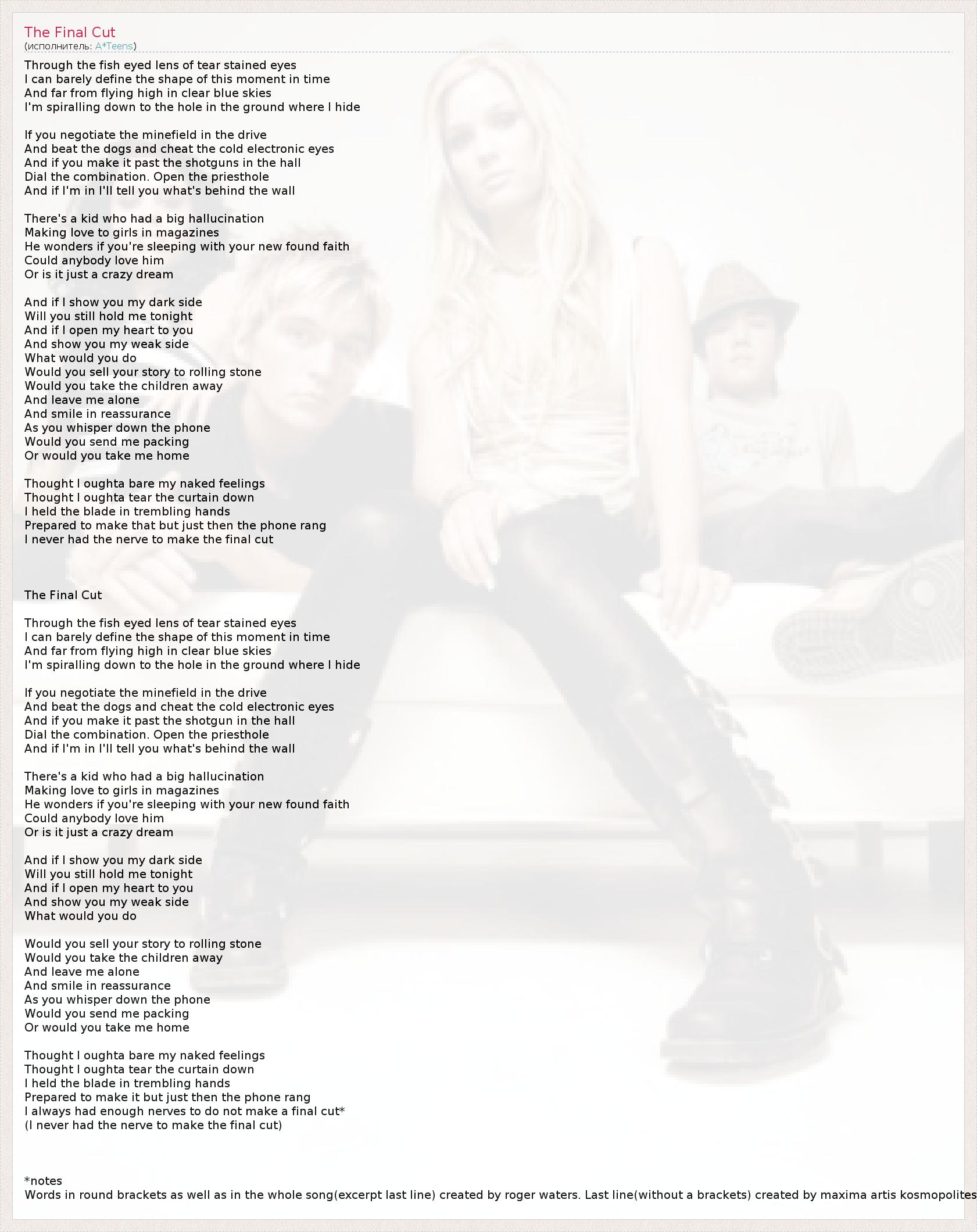 Строчка в финале принадлежит, как в переводе, так и в оригинале автору перевода и ковер версии Максиме Артису Космополитесу, так же известному как Максиму Васильевичу Найденко. Строка из скобок в оригинале и остальной текст принадлежат автору оригинала песни(Роджеру Вотерсу).