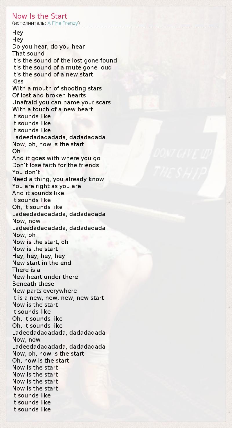 Hey Hey Do you hear, do you hear That sound It's the sound of the lost gone found It's the sound of a mute gone loud It's the sound of a new start Kiss With a mouth of shooting stars Of lost and broken hearts Unafraid you can name your scars With a touch of a new heart It sounds like It sounds like It sounds like Ladeedadadadada, dadadadada Now, oh, now is the start Oh And it goes with where you go Don't lose faith for the friends You don't Need a thing, you already know You are right as you are And it sounds like It sounds like Oh, it sounds like Ladeedadadadada, dadadadada Now, now Ladeedadadadada, dadadadada Now, oh Now is the start, oh Now is the start Hey, hey, hey, hey New start in the end There is a New heart under there Beneath these New parts everywhere It is a new, new, new, new start Now is the start It sounds like Oh, it sounds like Oh, it sounds like Ladeedadadadada, dadadadada Now, now Ladeedadadadada, dadadadada Now, oh, now is the start Oh, now is the start Now is the start Now is the start Now is the start Now is the start It sounds like It sounds like It sounds like