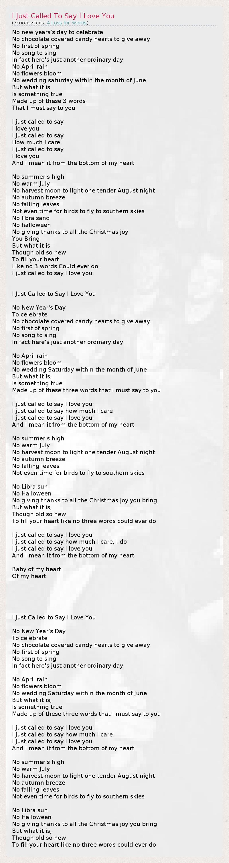 No new years's day to celebrate No chocolate covered candy hearts to give away No first of spring No song to sing In fact here's just another ordinary day No April rain No flowers bloom No wedding saturday within the month of June But what it is Is something true Made up of these 3 words That I must say to you I just called to say I love you I just called to say How much I care I just called to say I love you And I mean it from the bottom of my heart No summer's high No warm July No harvest moon to light one tender August night No autumn breeze No falling leaves Not even time for birds to fly to southern skies No libra sand No halloween No giving thanks to all the Christmas joy You Bring But what it is Though old so new To fill your heart Like no 3 words Could ever do. I just called to say I love you I Just Called to Say I Love You No New Year's Day To celebrate No chocolate covered candy hearts to give away No first of spring No song to sing In fact here's just another ordinary day No April rain No flowers bloom No wedding Saturday within the month of June But what it is, Is something true Made up of these three words that I must say to you I just called to say I love you I just called to say how much I care I just called to say I love you And I mean it from the bottom of my heart No summer's high No warm July No harvest moon to light one tender August night No autumn breeze No falling leaves Not even time for birds to fly to southern skies No Libra sun No Halloween No giving thanks to all the Christmas joy you bring But what it is, Though old so new To fill your heart like no three words could ever do I just called to say I love you I just called to say how much I care, I do I just called to say I love you And I mean it from the bottom of my heart Baby of my heart Of my heart I Just Called to Say I Love You No New Year's Day To celebrate No chocolate covered candy hearts to give away No first of spring No song to sing In fact here's just another ordinary day No April rain No flowers bloom No wedding Saturday within the month of June But what it is, Is something true Made up of these three words that I must say to you I just called to say I love you I just called to say how much I care I just called to say I love you And I mean it from the bottom of my heart No summer's high No warm July No harvest moon to light one tender August night No autumn breeze No falling leaves Not even time for birds to fly to southern skies No Libra sun No Halloween No giving thanks to all the Christmas joy you bring But what it is, Though old so new To fill your heart like no three words could ever do