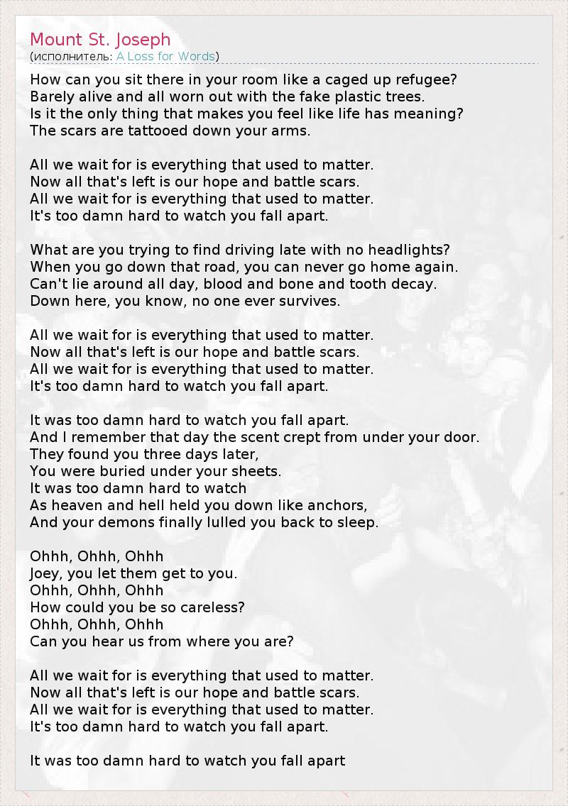 How can you sit there in your room like a caged up refugee? Barely alive and all worn out with the fake plastic trees. Is it the only thing that makes you feel like life has meaning? The scars are tattooed down your arms. All we wait for is everything that used to matter. Now all that's left is our hope and battle scars. All we wait for is everything that used to matter. It's too damn hard to watch you fall apart. What are you trying to find driving late with no headlights? When you go down that road, you can never go home again. Can't lie around all day, blood and bone and tooth decay. Down here, you know, no one ever survives. All we wait for is everything that used to matter. Now all that's left is our hope and battle scars. All we wait for is everything that used to matter. It's too damn hard to watch you fall apart. It was too damn hard to watch you fall apart. And I remember that day the scent crept from under your door. They found you three days later, You were buried under your sheets. It was too damn hard to watch As heaven and hell held you down like anchors, And your demons finally lulled you back to sleep. Ohhh, Ohhh, Ohhh Joey, you let them get to you. Ohhh, Ohhh, Ohhh How could you be so careless? Ohhh, Ohhh, Ohhh Can you hear us from where you are? All we wait for is everything that used to matter. Now all that's left is our hope and battle scars. All we wait for is everything that used to matter. It's too damn hard to watch you fall apart. It was too damn hard to watch you fall apart
