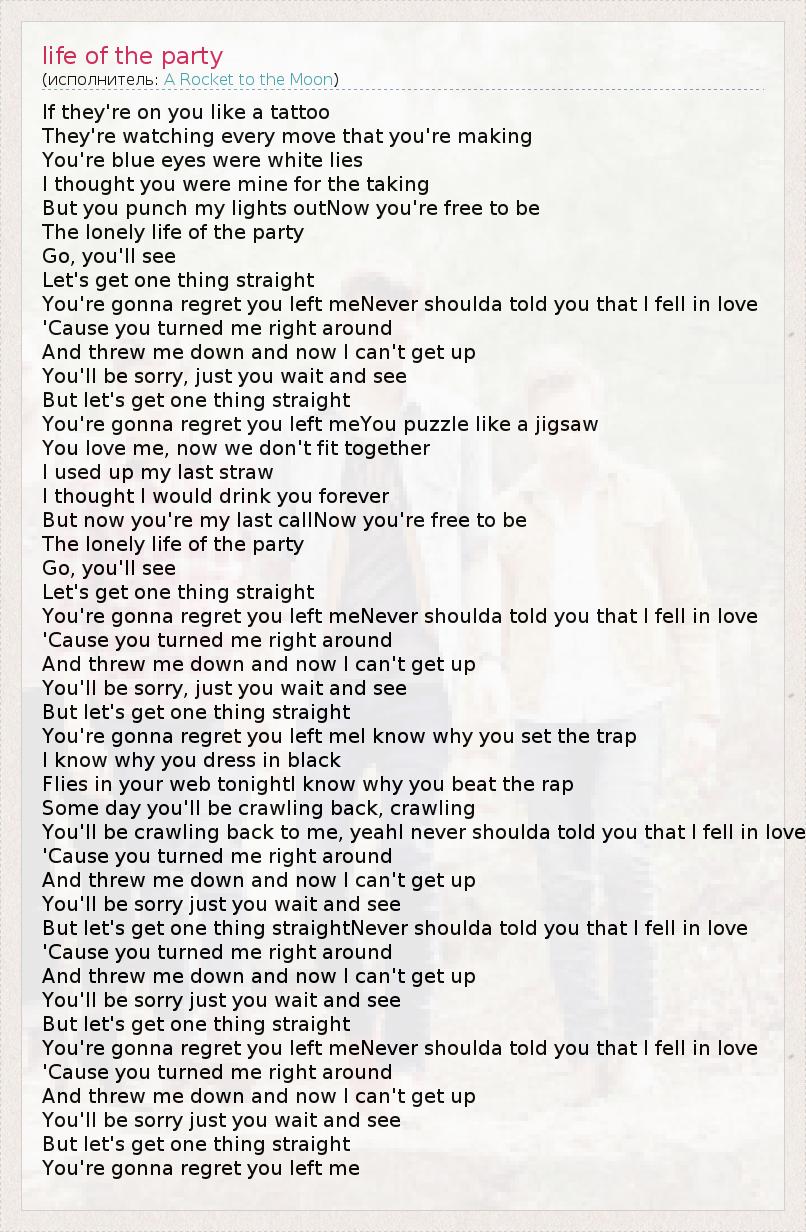 If they're on you like a tattoo They're watching every move that you're making You're blue eyes were white lies I thought you were mine for the taking But you punch my lights outNow you're free to be The lonely life of the party Go, you'll see Let's get one thing straight You're gonna regret you left meNever shoulda told you that I fell in love 'Cause you turned me right around And threw me down and now I can't get up You'll be sorry, just you wait and see But let's get one thing straight You're gonna regret you left meYou puzzle like a jigsaw You love me, now we don't fit together I used up my last straw I thought I would drink you forever But now you're my last callNow you're free to be The lonely life of the party Go, you'll see Let's get one thing straight You're gonna regret you left meNever shoulda told you that I fell in love 'Cause you turned me right around And threw me down and now I can't get up You'll be sorry, just you wait and see But let's get one thing straight You're gonna regret you left meI know why you set the trap I know why you dress in black Flies in your web tonightI know why you beat the rap Some day you'll be crawling back, crawling You'll be crawling back to me, yeahI never shoulda told you that I fell in love 'Cause you turned me right around And threw me down and now I can't get up You'll be sorry just you wait and see But let's get one thing straightNever shoulda told you that I fell in love 'Cause you turned me right around And threw me down and now I can't get up You'll be sorry just you wait and see But let's get one thing straight You're gonna regret you left meNever shoulda told you that I fell in love 'Cause you turned me right around And threw me down and now I can't get up You'll be sorry just you wait and see But let's get one thing straight You're gonna regret you left me