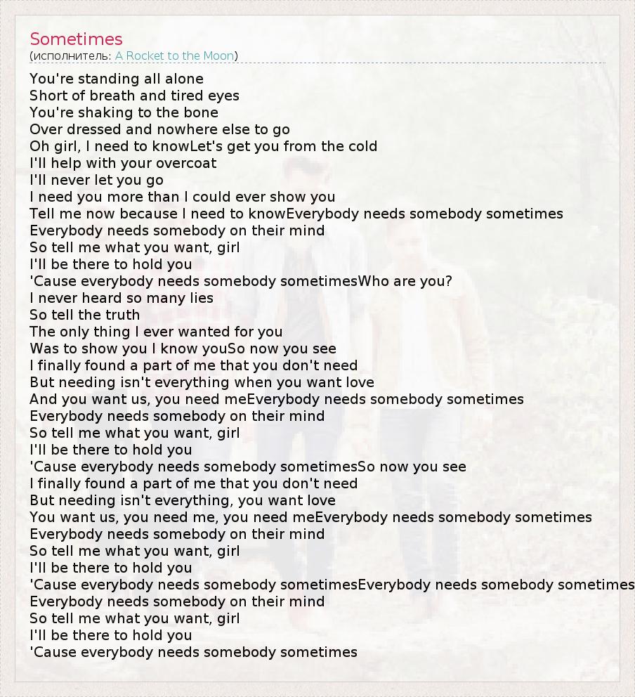 'Cause everybody needs somebody sometimesEverybody needs somebody sometimes