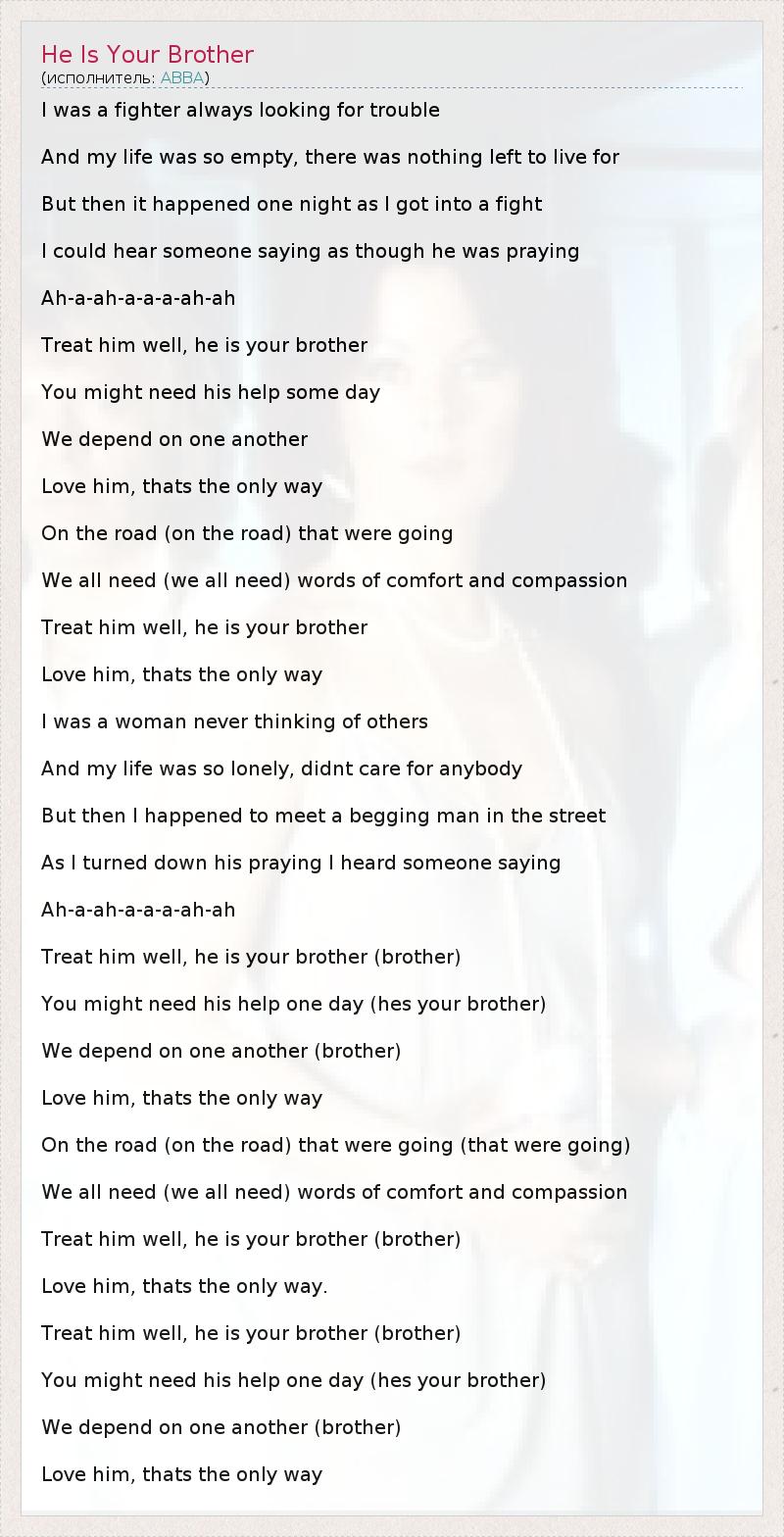 I was a fighter always looking for trouble And my life was so empty, there was nothing left to live for But then it happened one night as I got into a fight I could hear someone saying as though he was praying Ah-a-ah-a-a-a-ah-ah Treat him well, he is your brother You might need his help some day We depend on one another Love him, thats the only way On the road (on the road) that were going We all need (we all need) words of comfort and compassion Treat him well, he is your brother Love him, thats the only way I was a woman never thinking of others And my life was so lonely, didnt care for anybody But then I happened to meet a begging man in the street As I turned down his praying I heard someone saying Ah-a-ah-a-a-a-ah-ah Treat him well, he is your brother (brother) You might need his help one day (hes your brother) We depend on one another (brother) Love him, thats the only way On the road (on the road) that were going (that were going) We all need (we all need) words of comfort and compassion Treat him well, he is your brother (brother) Love him, thats the only way. Treat him well, he is your brother (brother) You might need his help one day (hes your brother) We depend on one another (brother) Love him, thats the only way
