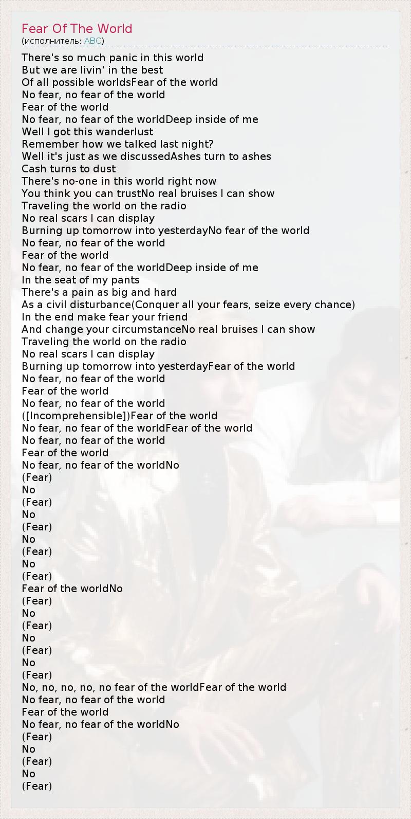 There's so much panic in this world But we are livin' in the best Of all possible worldsFear of the world No fear, no fear of the world Fear of the world No fear, no fear of the worldDeep inside of me Well I got this wanderlust Remember how we talked last night? Well it's just as we discussedAshes turn to ashes Cash turns to dust There's no-one in this world right now You think you can trustNo real bruises I can show Traveling the world on the radio No real scars I can display Burning up tomorrow into yesterdayNo fear of the world No fear, no fear of the world Fear of the world No fear, no fear of the worldDeep inside of me In the seat of my pants There's a pain as big and hard As a civil disturbance(Conquer all your fears, seize every chance) In the end make fear your friend And change your circumstanceNo real bruises I can show Traveling the world on the radio No real scars I can display Burning up tomorrow into yesterdayFear of the world No fear, no fear of the world Fear of the world No fear, no fear of the world ([Incomprehensible])Fear of the world No fear, no fear of the worldFear of the world No fear, no fear of the world Fear of the world No fear, no fear of the worldNo (Fear) No (Fear) No (Fear) No (Fear) No (Fear) Fear of the worldNo (Fear) No (Fear) No (Fear) No (Fear) No, no, no, no, no fear of the worldFear of the world No fear, no fear of the world Fear of the world No fear, no fear of the worldNo (Fear) No (Fear) No (Fear)