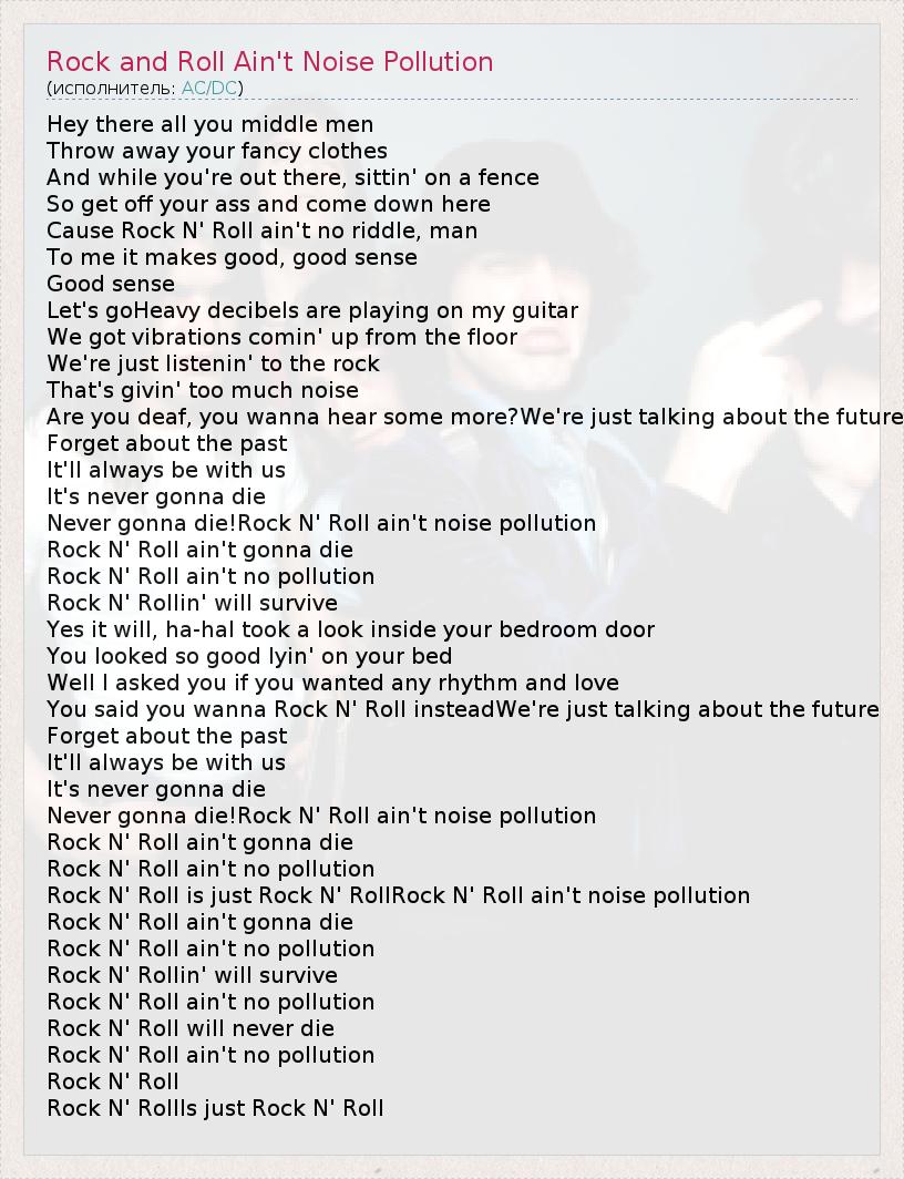 Hey there all you middle men Throw away your fancy clothes And while you're out there, sittin' on a fence So get off your ass and come down here Cause Rock N' Roll ain't no riddle, man To me it makes good, good sense Good sense Let's goHeavy decibels are playing on my guitar We got vibrations comin' up from the floor We're just listenin' to the rock That's givin' too much noise Are you deaf, you wanna hear some more?We're just talking about the future Forget about the past It'll always be with us It's never gonna die Never gonna die!Rock N' Roll ain't noise pollution Rock N' Roll ain't gonna die Rock N' Roll ain't no pollution Rock N' Rollin' will survive Yes it will, ha-haI took a look inside your bedroom door You looked so good lyin' on your bed Well I asked you if you wanted any rhythm and love You said you wanna Rock N' Roll insteadWe're just talking about the future Forget about the past It'll always be with us It's never gonna die Never gonna die!Rock N' Roll ain't noise pollution Rock N' Roll ain't gonna die Rock N' Roll ain't no pollution Rock N' Roll is just Rock N' RollRock N' Roll ain't noise pollution Rock N' Roll ain't gonna die Rock N' Roll ain't no pollution Rock N' Rollin' will survive Rock N' Roll ain't no pollution Rock N' Roll will never die Rock N' Roll ain't no pollution Rock N' Roll Rock N' RollIs just Rock N' Roll