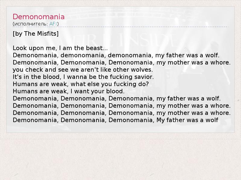 Demonomania, demonomania, demonomania, my father was a wolf.