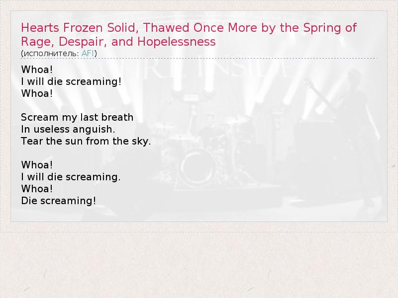 Главная→Исполнители→AFI→Hearts Frozen Solid, Thawed Once More by the Spring of Rage, Despair, and Hopelessness