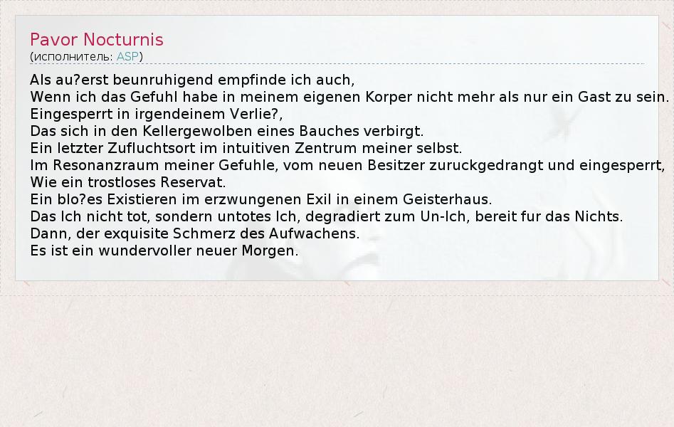 Это интересно:ASP (произносится одним словом, «АСП», а не как аббревиатура) — немецкая группа из Франкфурта-на-Майне; в их музыке сочетается влияние альтернативного рока, индастриал метала, электронной музыки, фолка и дарквэйва с добавлением готического антуража. Известность им принёс цикл Schwarzen Schmetterling («чёрная бабочка»), в который вошли первые пять альбомов группы; цикл можно рассматривать как готический... продолжение