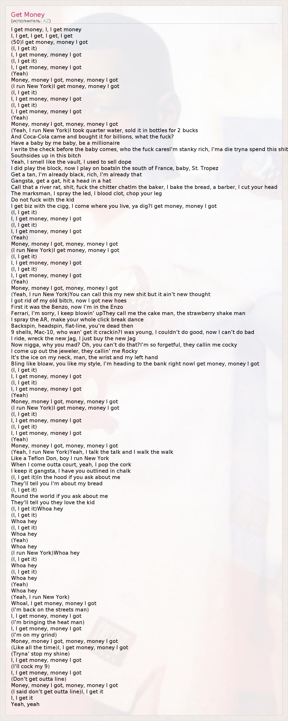 I get money, I, I get money I, I get, I get, I get, I get (50)I get money, money I got (I, I get it) I, I get money, money I got (I, I get it) I, I get money, money I got (Yeah) Money, money I got, money, money I got (I run New York)I get money, money I got (I, I get it) I, I get money, money I got (I, I get it) I, I get money, money I got (Yeah) Money, money I got, money, money I got (Yeah, I run New York)I took quarter water, sold it in bottles for 2 bucks And Coca-Cola came and bought it for billions, what the fuck? Have a baby by me baby, be a millionaire I write the check before the baby comes, who the fuck caresI'm stanky rich, I'ma die tryna spend this shit Southsides up in this bitch Yeah, I smell like the vault, I used to sell dope I did play the block, now I play on boatsIn the south of France, baby, St. Tropez Get a tan, I'm already black, rich, I'm already that Gangsta, get a gat, hit a head in a hat Call that a river rat, shit, fuck the chitter chatIm the baker, I bake the bread, a barber, I cut your head The marksman, I spray the led, I blood clot, chop your leg Do not fuck with the kid I get biz with the cigg, I come where you live, ya dig?I get money, money I got (I, I get it) I, I get money, money I got (I, I get it) I, I get money, money I got (Yeah) Money, money I got, money, money I got (I run New York)I get money, money I got (I, I get it) I, I get money, money I got (I, I get it) I, I get money, money I got (Yeah) Money, money I got, money, money I got (Yeah, I run New York)You can call this my new shit but it ain't new thought I got rid of my old bitch, now I got new hoes First it was the Benzo, now I'm in the Enzo Ferrari, I'm sorry, I keep blowin' upThey call me the cake man, the strawberry shake man I spray the AR, make your whole click break dance Backspin, headspin, flat-line, you're dead then 9 shells, Mac-10, who wan' get it crackin?I was young, I couldn't do good, now I can't do bad I ride, wreck the new Jag, I just buy the new Jag Now nigga, why you mad? Oh, you can't do that?I'm so forgetful, they callin me cocky I come up out the jeweler, they callin' me Rocky It's the ice on my neck, man, the wrist and my left hand Bling like bloaw, you like my style, I'm heading to the bank right nowI get money, money I got (I, I get it) I, I get money, money I got (I, I get it) I, I get money, money I got (Yeah) Money, money I got, money, money I got (I run New York)I get money, money I got (I, I get it) I, I get money, money I got (I, I get it) I, I get money, money I got (Yeah) Money, money I got, money, money I got (Yeah, I run New York)Yeah, I talk the talk and I walk the walk Like a Teflon Don, boy I run New York When I come outta court, yeah, I pop the cork I keep it gangsta, I have you outlined in chalk (I, I get it)In the hood if you ask about me They'll tell you I'm about my bread (I, I get it) Round the world if you ask about me They'll tell you they love the kid (I, I get it)Whoa hey (I, I get it) Whoa hey (I, I get it) Whoa hey (Yeah) Whoa hey (I run New York)Whoa hey (I, I get it) Whoa hey (I, I get it) Whoa hey (Yeah) Whoa hey (Yeah, I run New York) WhoaI, I get money, money I got (I'm back on the streets man) I, I get money, money I got (I'm bringing the heat man) I, I get money, money I got (I'm on my grind) Money, money I got, money, money I got (Like all the time)I, I get money, money I got (Tryna' stop my shine) I, I get money, money I got (I'll cock my 9) I, I get money, money I got (Don't get outta line) Money, money I got, money, money I got (I said don't get outta line)I, I get it I, I get it Yeah, yeah
