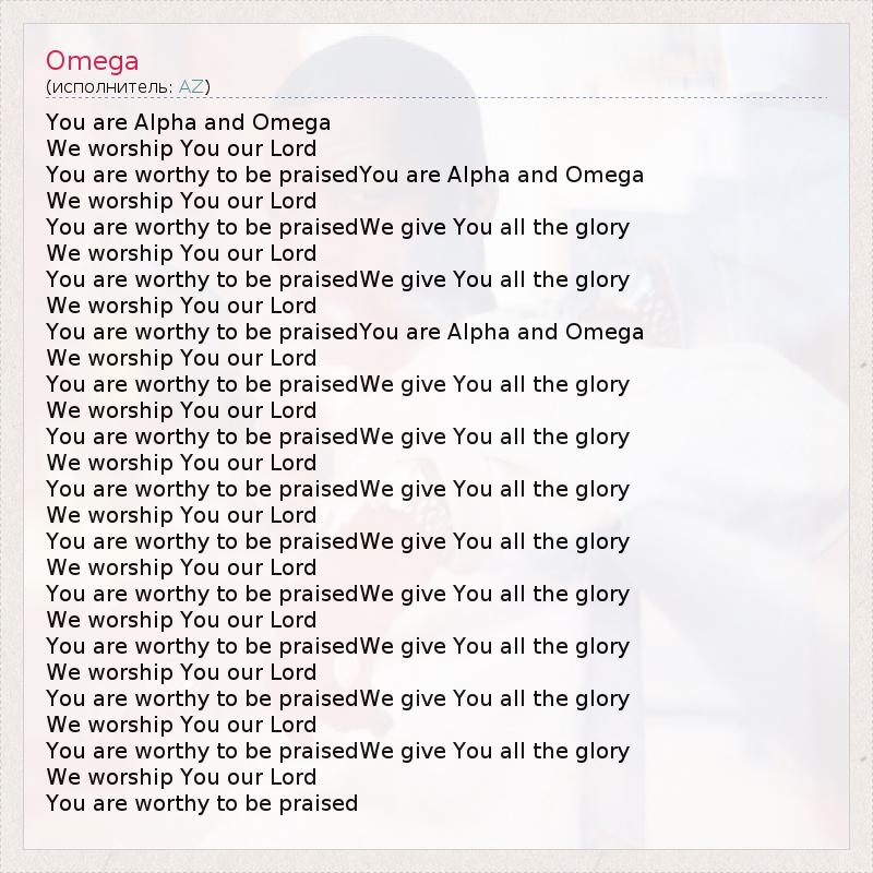 You are Alpha and Omega We worship You our Lord You are worthy to be praisedYou are Alpha and Omega We worship You our Lord You are worthy to be praisedWe give You all the glory We worship You our Lord You are worthy to be praisedWe give You all the glory We worship You our Lord You are worthy to be praisedYou are Alpha and Omega We worship You our Lord You are worthy to be praisedWe give You all the glory We worship You our Lord You are worthy to be praisedWe give You all the glory We worship You our Lord You are worthy to be praisedWe give You all the glory We worship You our Lord You are worthy to be praisedWe give You all the glory We worship You our Lord You are worthy to be praisedWe give You all the glory We worship You our Lord You are worthy to be praisedWe give You all the glory We worship You our Lord You are worthy to be praisedWe give You all the glory We worship You our Lord You are worthy to be praisedWe give You all the glory We worship You our Lord You are worthy to be praised