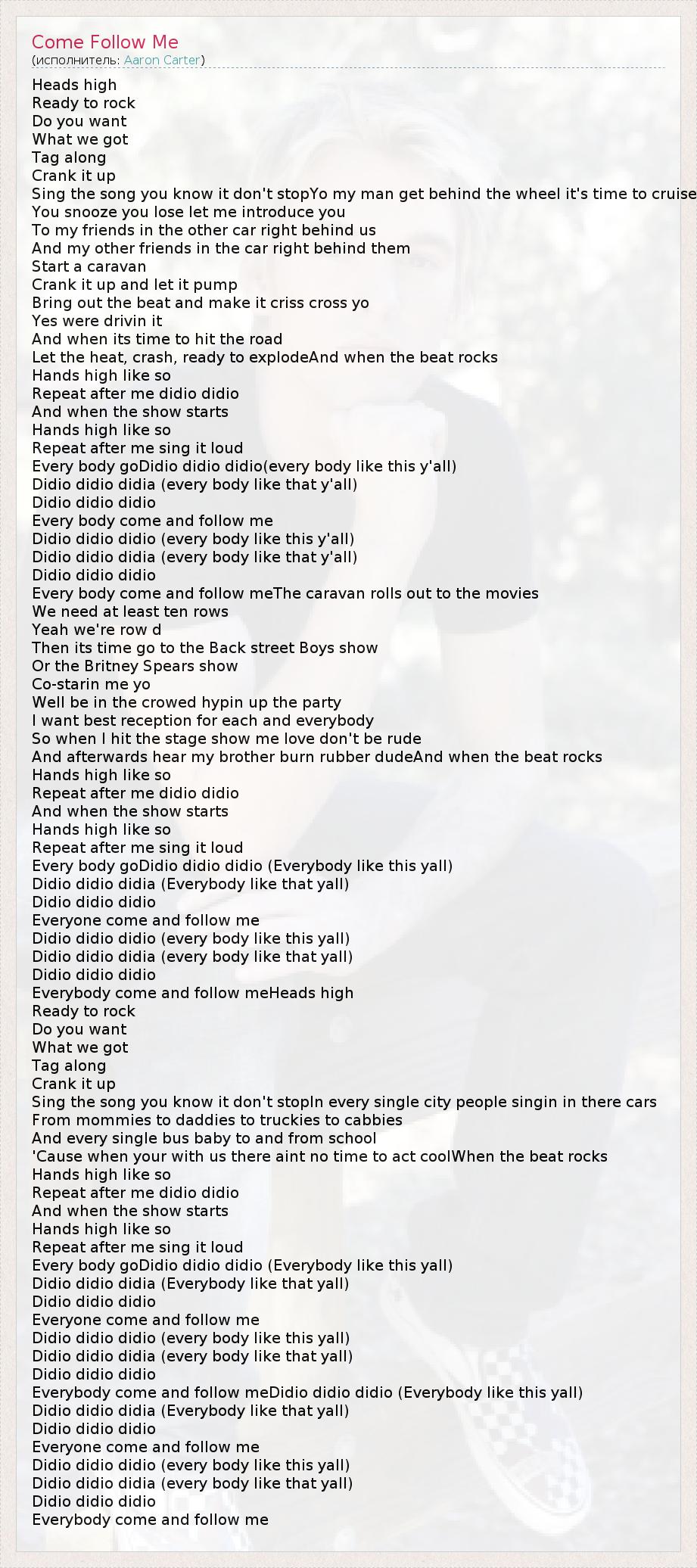 Это интересно:Аарон родился 7 декабря 1987г. в Тампе, Флорида. Петь начал в 6 лет. Брат Ника Картера из "Backstreet Boys". В 7 лет он создает группу “Dead End” (“Тупик”), но в 1996 году группа распадается. После этого начинается его сольная карьера.Его "Aaron's Party (Come Get It)" находился на вершинах альбомного чарта Billboard 200. Альбом "Aaron's Party …" был признан Звукозаписывающей Промышленной Ассоциацией Америки... продолжение