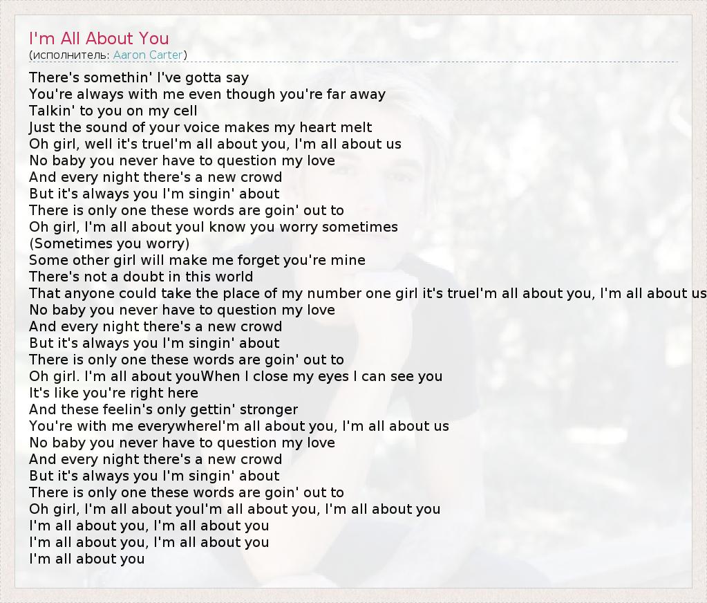 There's somethin' I've gotta say You're always with me even though you're far away Talkin' to you on my cell Just the sound of your voice makes my heart melt Oh girl, well it's trueI'm all about you, I'm all about us No baby you never have to question my love And every night there's a new crowd But it's always you I'm singin' about There is only one these words are goin' out to Oh girl, I'm all about youI know you worry sometimes (Sometimes you worry) Some other girl will make me forget you're mine There's not a doubt in this world That anyone could take the place of my number one girl it's trueI'm all about you, I'm all about us No baby you never have to question my love And every night there's a new crowd But it's always you I'm singin' about There is only one these words are goin' out to Oh girl. I'm all about youWhen I close my eyes I can see you It's like you're right here And these feelin's only gettin' stronger You're with me everywhereI'm all about you, I'm all about us No baby you never have to question my love And every night there's a new crowd But it's always you I'm singin' about There is only one these words are goin' out to Oh girl, I'm all about youI'm all about you, I'm all about you I'm all about you, I'm all about you I'm all about you, I'm all about you I'm all about you