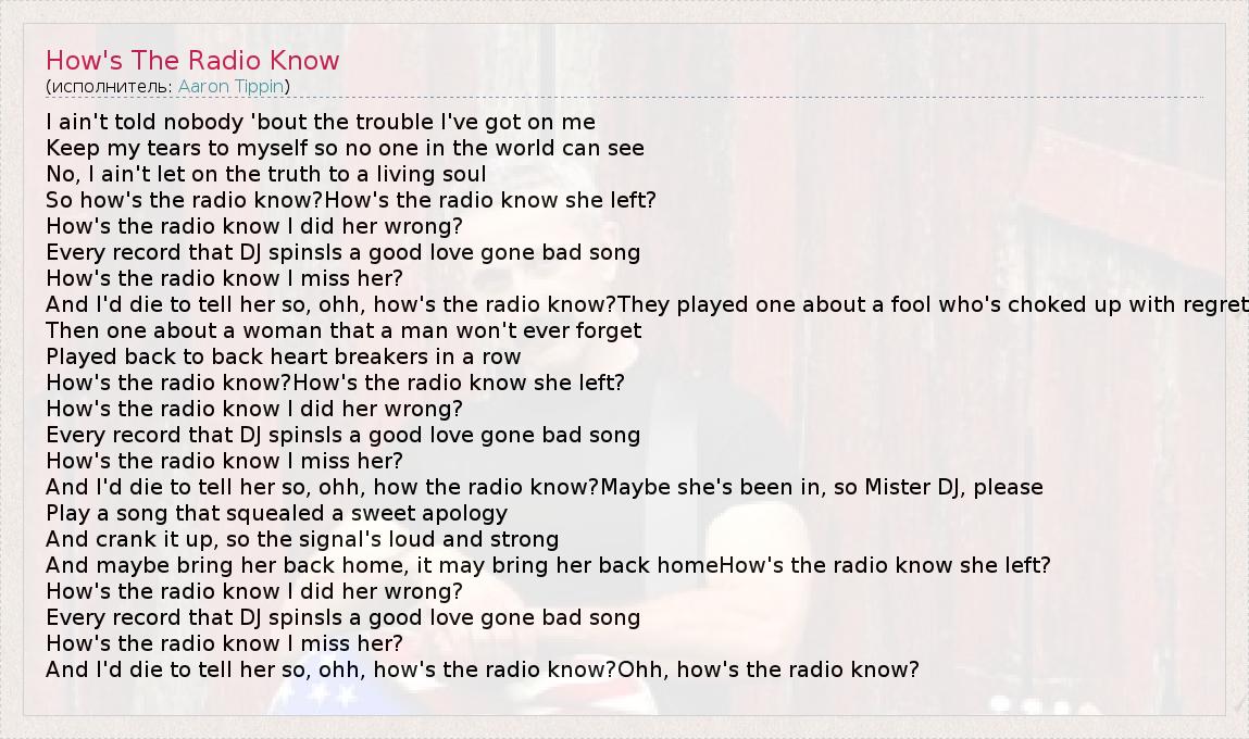 I ain't told nobody 'bout the trouble I've got on me Keep my tears to myself so no one in the world can see No, I ain't let on the truth to a living soul So how's the radio know?How's the radio know she left? How's the radio know I did her wrong? Every record that DJ spinsIs a good love gone bad song How's the radio know I miss her? And I'd die to tell her so, ohh, how's the radio know?They played one about a fool who's choked up with regret Then one about a woman that a man won't ever forget Played back to back heart breakers in a row How's the radio know?How's the radio know she left? How's the radio know I did her wrong? Every record that DJ spinsIs a good love gone bad song How's the radio know I miss her? And I'd die to tell her so, ohh, how the radio know?Maybe she's been in, so Mister DJ, please Play a song that squealed a sweet apology And crank it up, so the signal's loud and strong And maybe bring her back home, it may bring her back homeHow's the radio know she left? How's the radio know I did her wrong? Every record that DJ spinsIs a good love gone bad song How's the radio know I miss her? And I'd die to tell her so, ohh, how's the radio know?Ohh, how's the radio know?