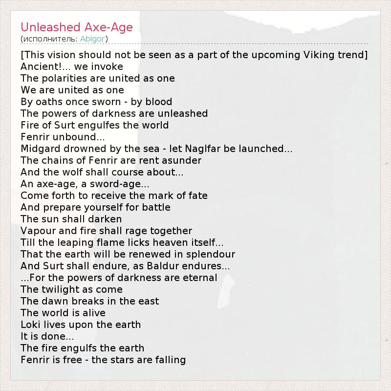 А как ты думаешь, о чем песня "Unleashed Axe-Age" ?