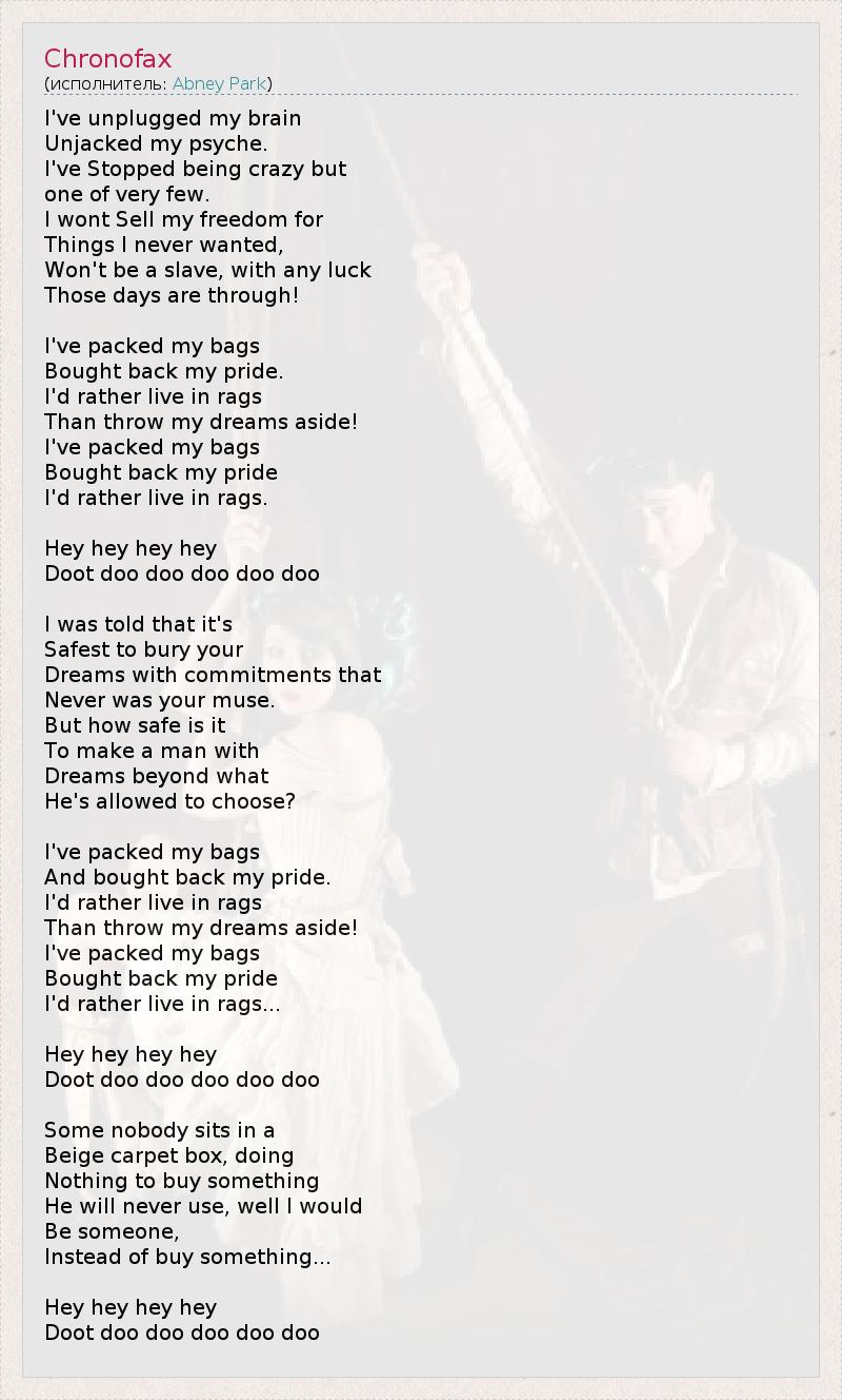 I've unplugged my brain Unjacked my psyche. I've Stopped being crazy but one of very few. I wont Sell my freedom for Things I never wanted, Won't be a slave, with any luck Those days are through! I've packed my bags Bought back my pride. I'd rather live in rags Than throw my dreams aside! I've packed my bags Bought back my pride I'd rather live in rags. Hey hey hey hey Doot doo doo doo doo doo I was told that it's Safest to bury your Dreams with commitments that Never was your muse. But how safe is it To make a man with Dreams beyond what He's allowed to choose? I've packed my bags And bought back my pride. I'd rather live in rags Than throw my dreams aside! I've packed my bags Bought back my pride I'd rather live in rags... Hey hey hey hey Doot doo doo doo doo doo Some nobody sits in a Beige carpet box, doing Nothing to buy something He will never use, well I would Be someone, Instead of buy something... Hey hey hey hey Doot doo doo doo doo doo