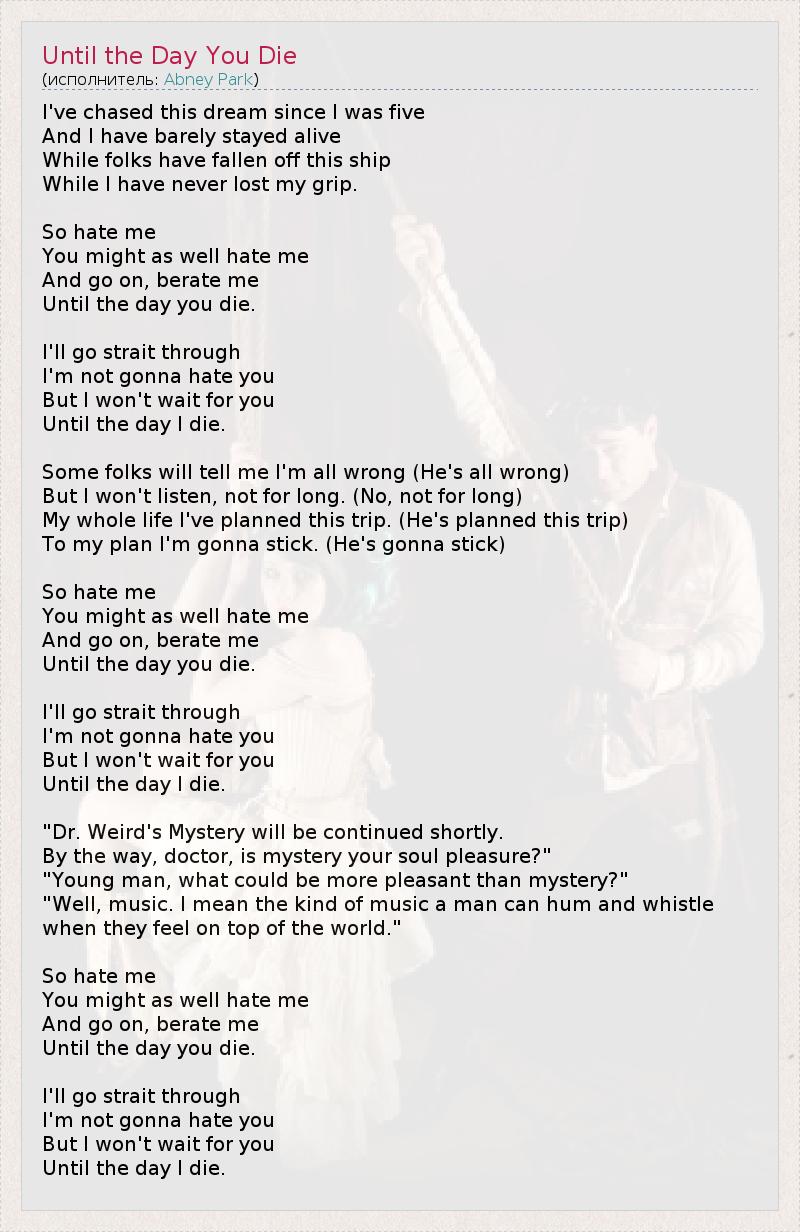 Я преследовал эту мечту с пяти лет, И я едва остался жив. В то время как люди падали за борт, Я никогда не терял хватку. Меня ненавидят, И вы можете ненавидеть меня, И даже ругать меня До дня вашей смерти. Я пройду через пролив, Я не буду ненавидеть тебя, Но я не буду ждать тебя До дня своей смерти. Некоторые скажут, что всё неправильно, (Он неправ во всём) Но я не послушаю, никогда. (Нет, никогда) Всю жизнь я планировал эту поездку. (Он планировал её) И я собираюсь придерживаться своего плана. (Он пойдёт до конца) Меня ненавидят, И вы можете ненавидеть меня, И даже ругать меня До дня вашей смерти. Я пройду через пролив, Я не буду ненавидеть тебя, Но я не буду ждать тебя До дня своей смерти. "Тайна доктора Верда совсем скоро получит продолжение. Кстати, доктор, тайна радует вашу душу?" "Молодой человек, что может быть прекраснее тайны?" "Думаю, музыка. Та музыка, которую человек напевает и насвистывает, когда находится на вершине мира." Меня ненавидят, И вы можете ненавидеть меня, И даже ругать меня До дня вашей смерти. Я пройду через пролив, Я не буду ненавидеть тебя, Но я не буду ждать тебя До дня своей смерти.